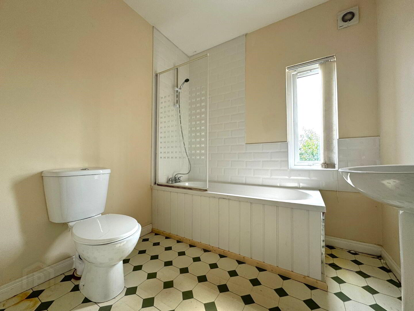 White suite comprising of panelled bath, low flush WC, pedestal wash hand basin with mixer tap, window to rear aspect.