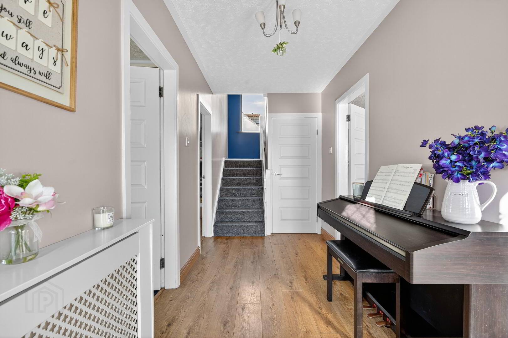 PVC entrance door, laminate wood flooring, stairs to first floor, storage cupboard.