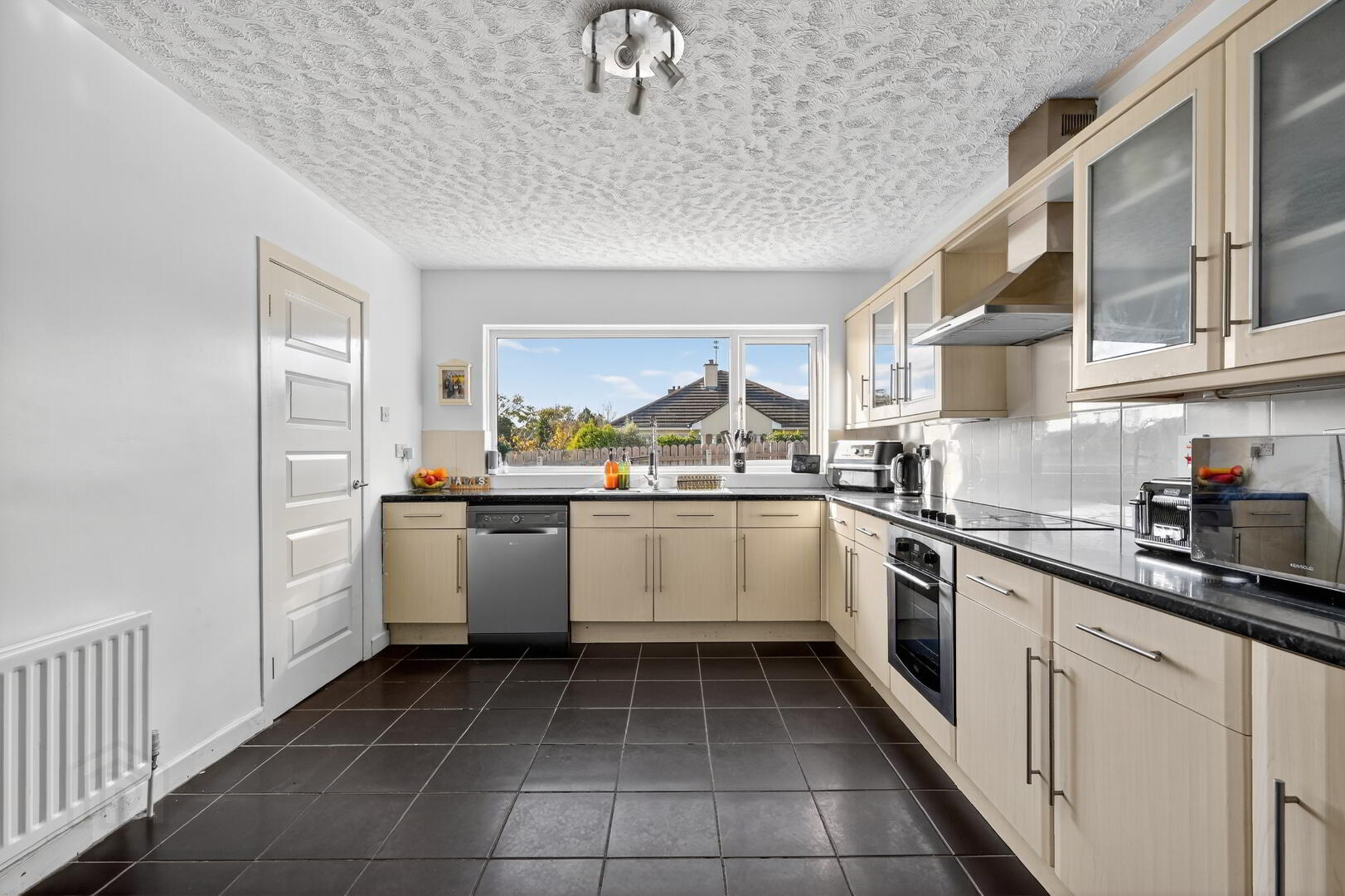 Fitted in a range of high and low level units with contrasting laminate work surfaces, inlaid 1½ bowl stainless steel sink unit with mixer tap, integrated oven, hob and stainless steel extractor fan, recess for fridge, plumbed for dishwasher, tiled flooring, window to enclosed rear.