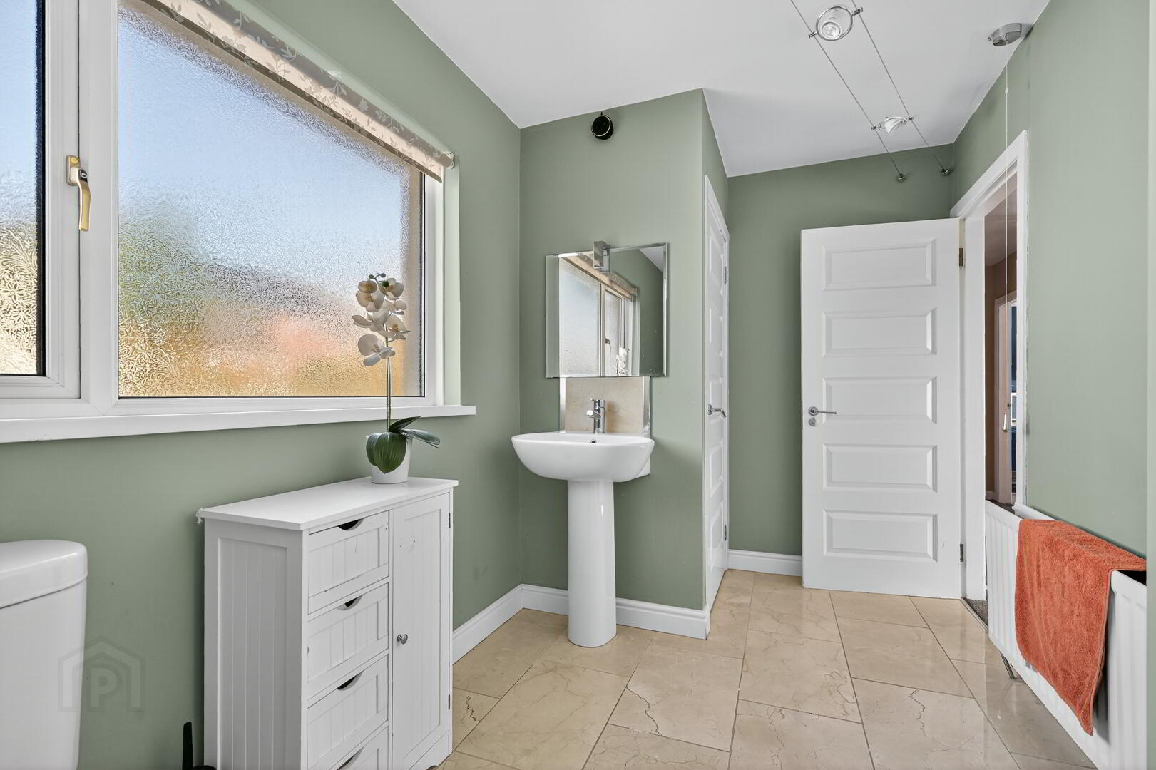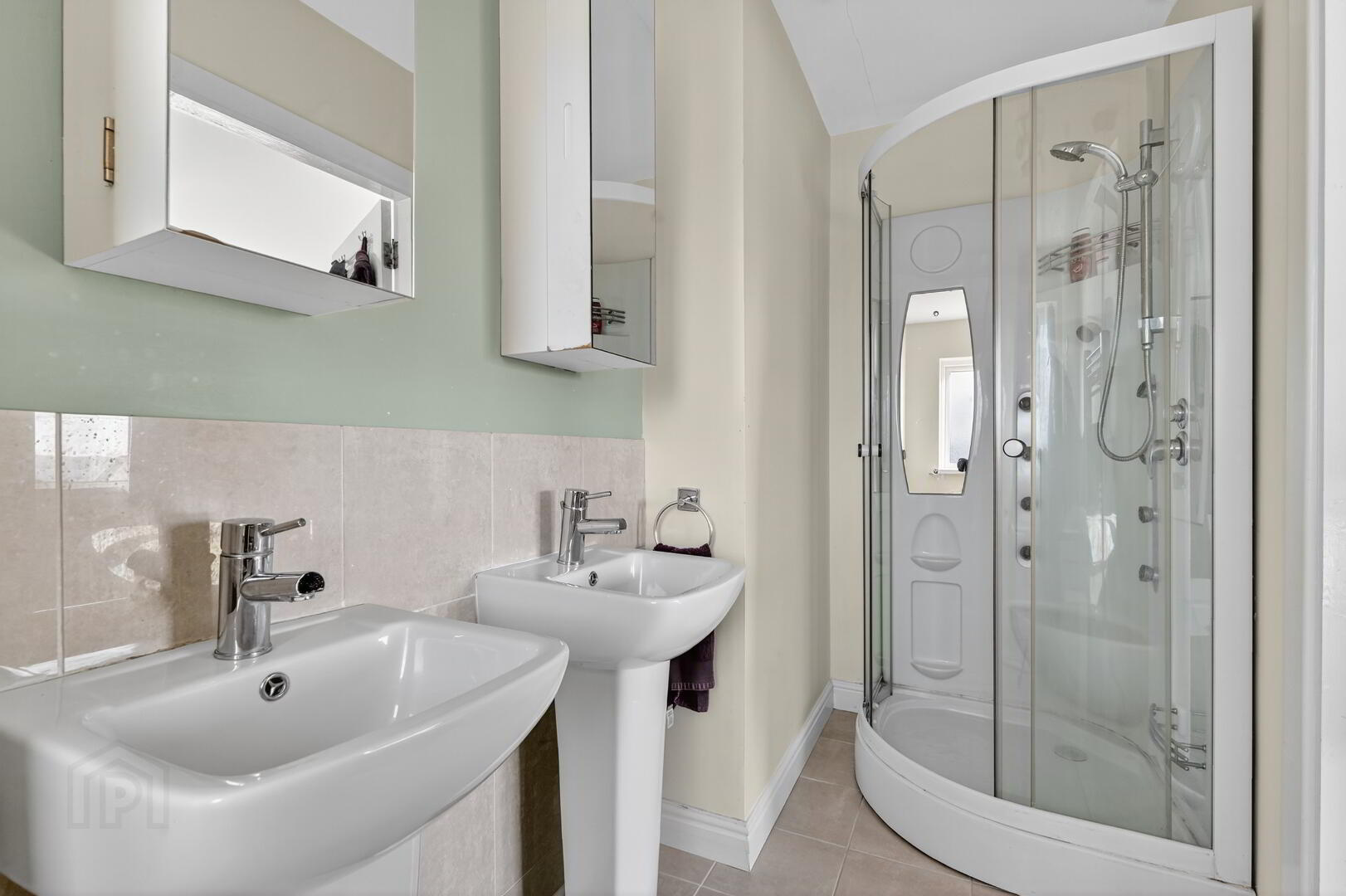 His & Hers white pedestal sinks with stainless steel mixer taps, chrome towel rail, shower cubicle with body jets, part tiled walls, tiled floor, window to side aspect, low flush WC.