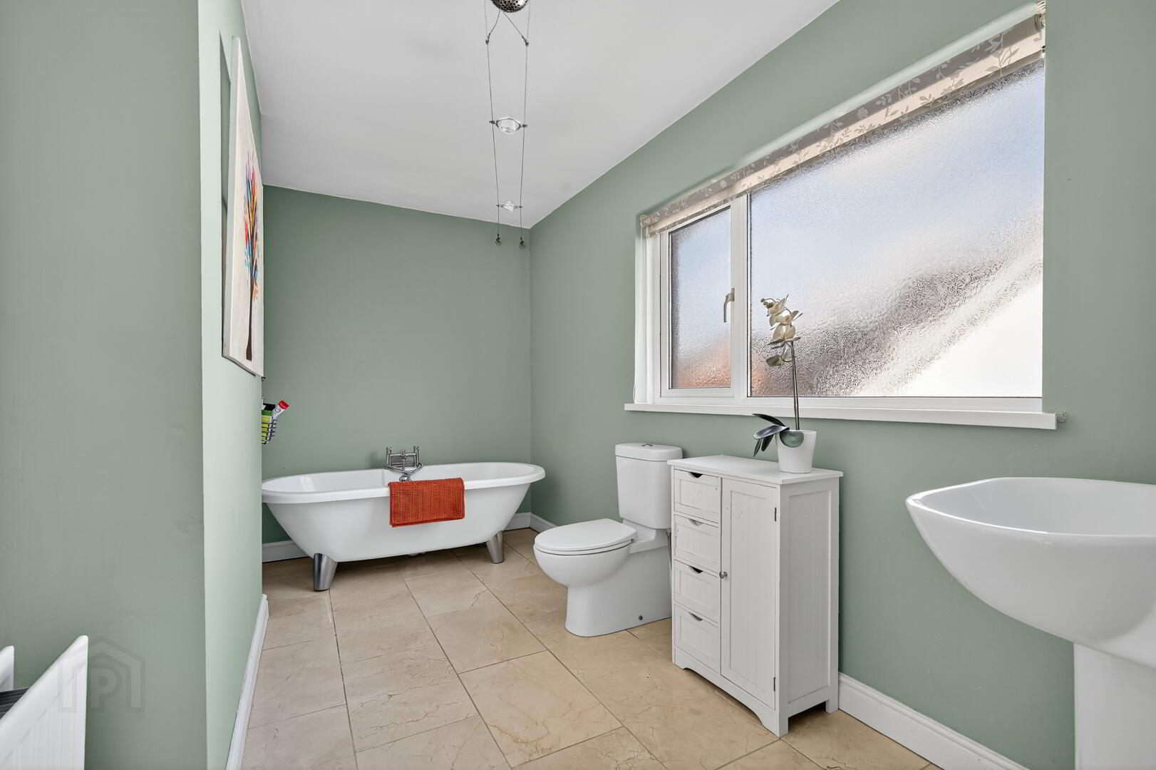 White 3 piece suite comprising slipper bath with stainless steel feet and shower attachment, pedestal wash hand basin with mixer tap, low flush WC, storage cupboard, window to rear aspect, tiled flooring.