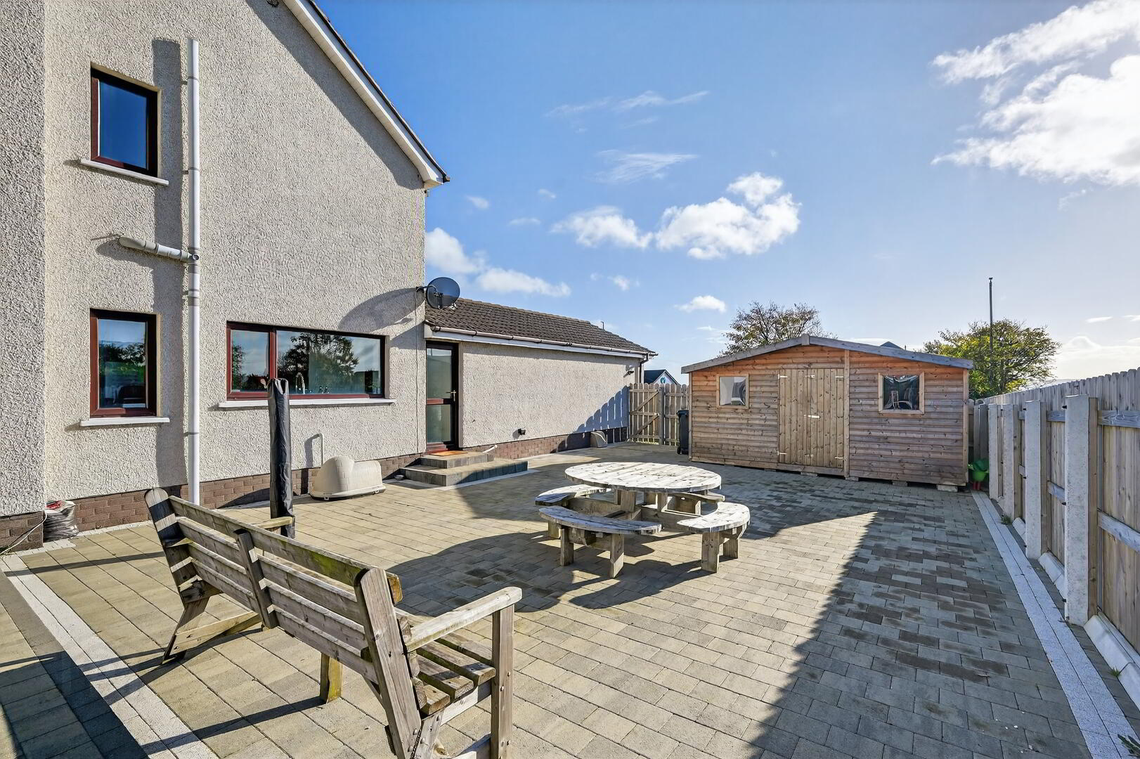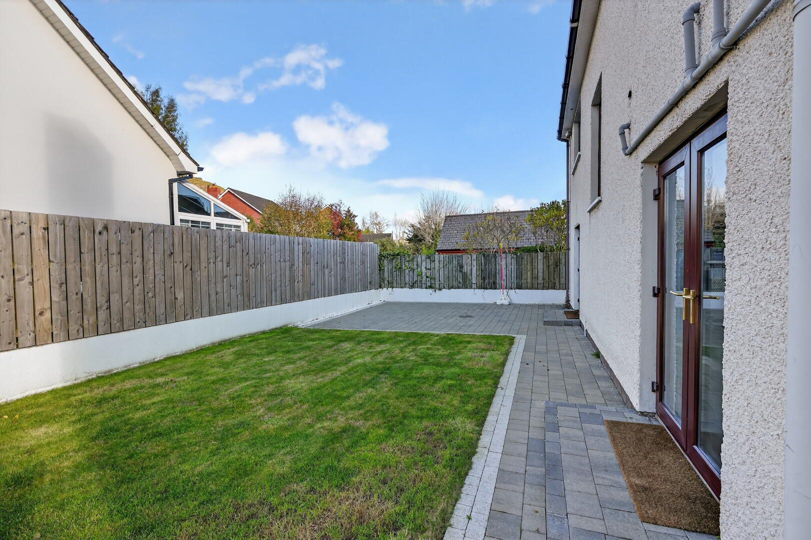 Fully enclosed rear and side laid in lawn, patio and wood chippings, bounded by fence and wall.