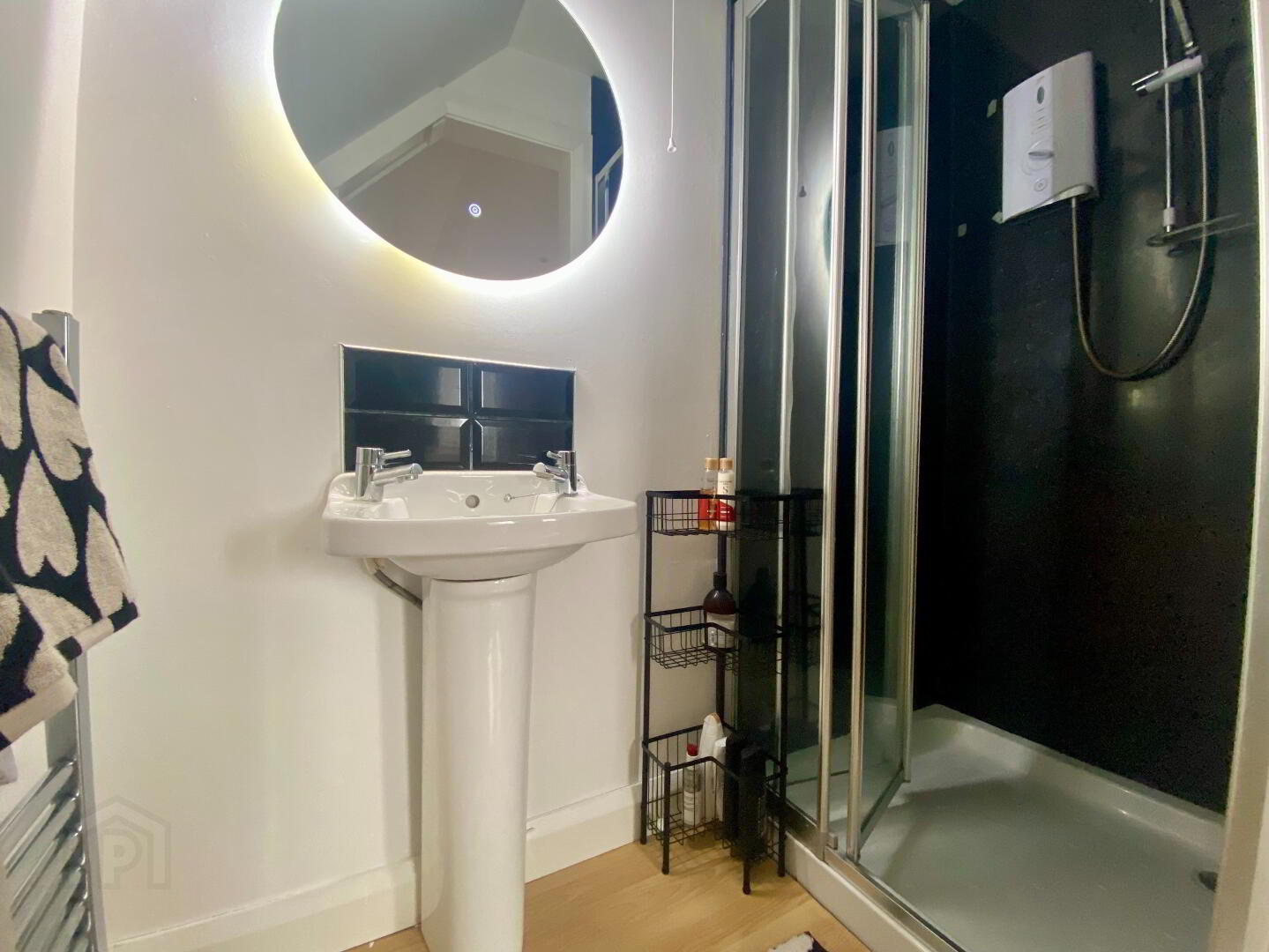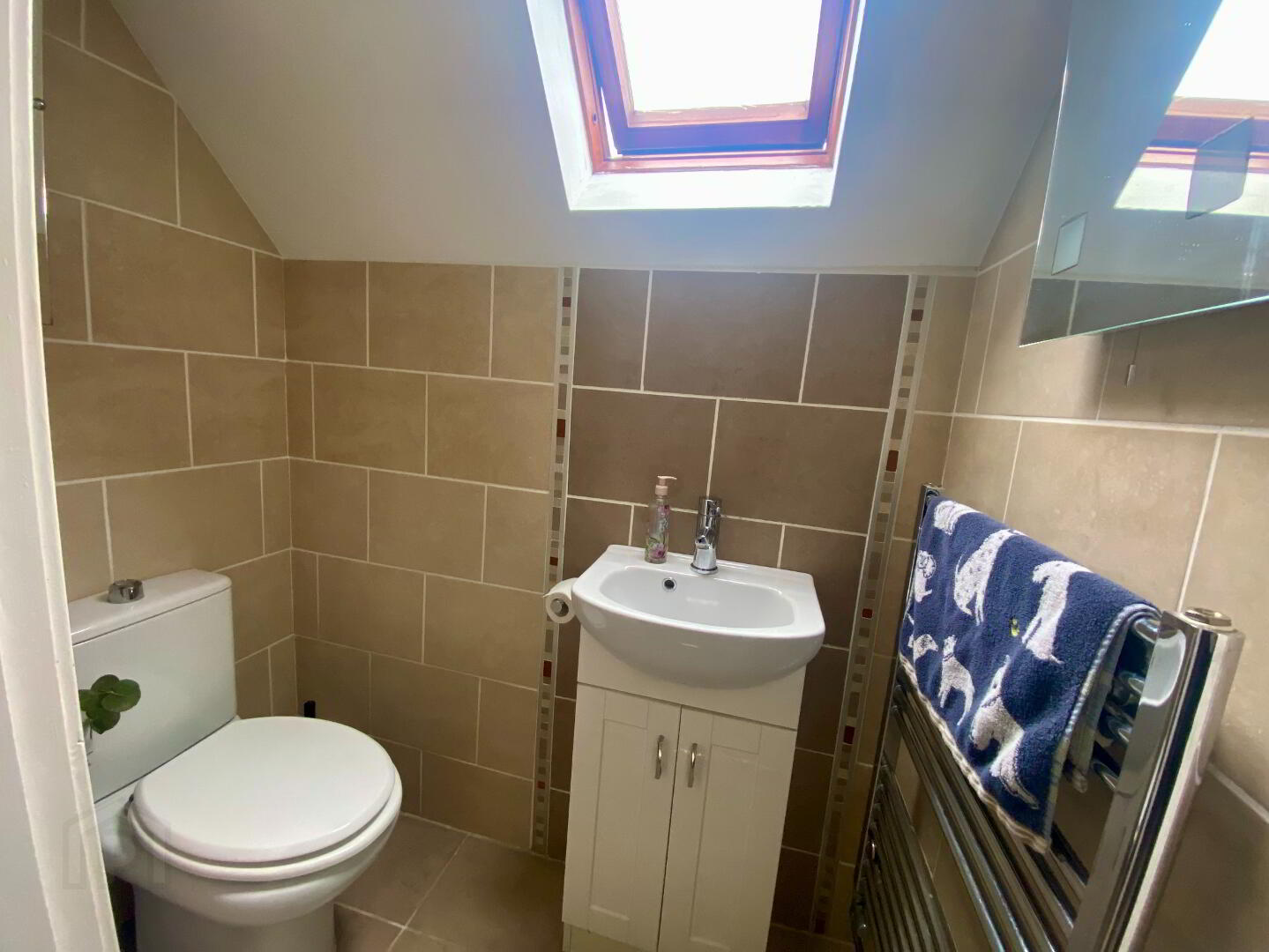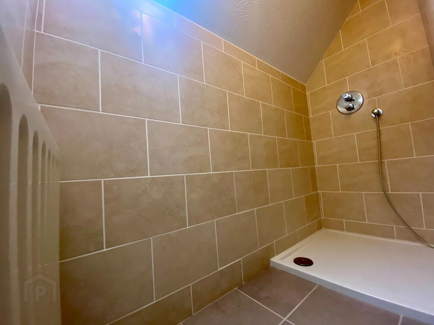 Fully tiled shower cubicle with stainless steel power shower, Velux window.