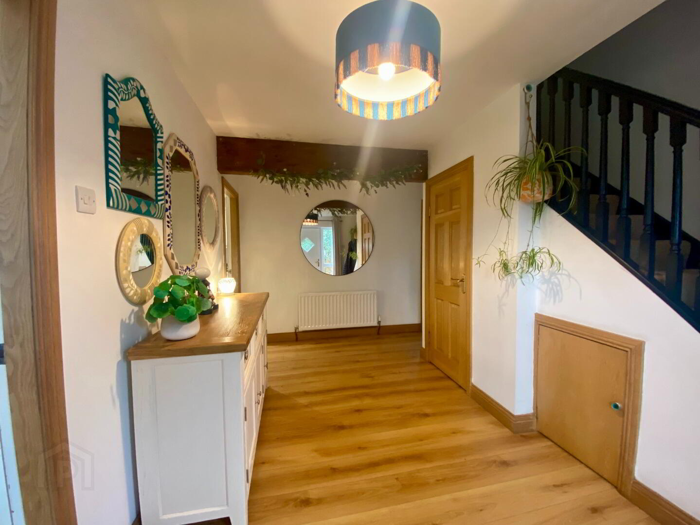 PVC entrance door, solid wood flooring, stairs to first Floor, storage cupboard.