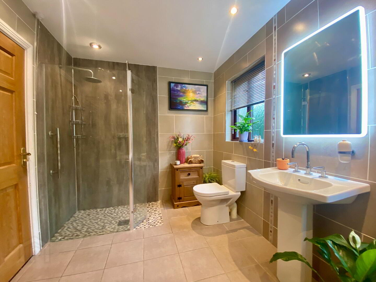 White piece suite comprising low flush WC, pedestal sink with stainless steel mixer tap, fully tiled shower cubicle with rainfall attachment, fully tiled bath with stainless steel mixer tap, vanity mirror.
