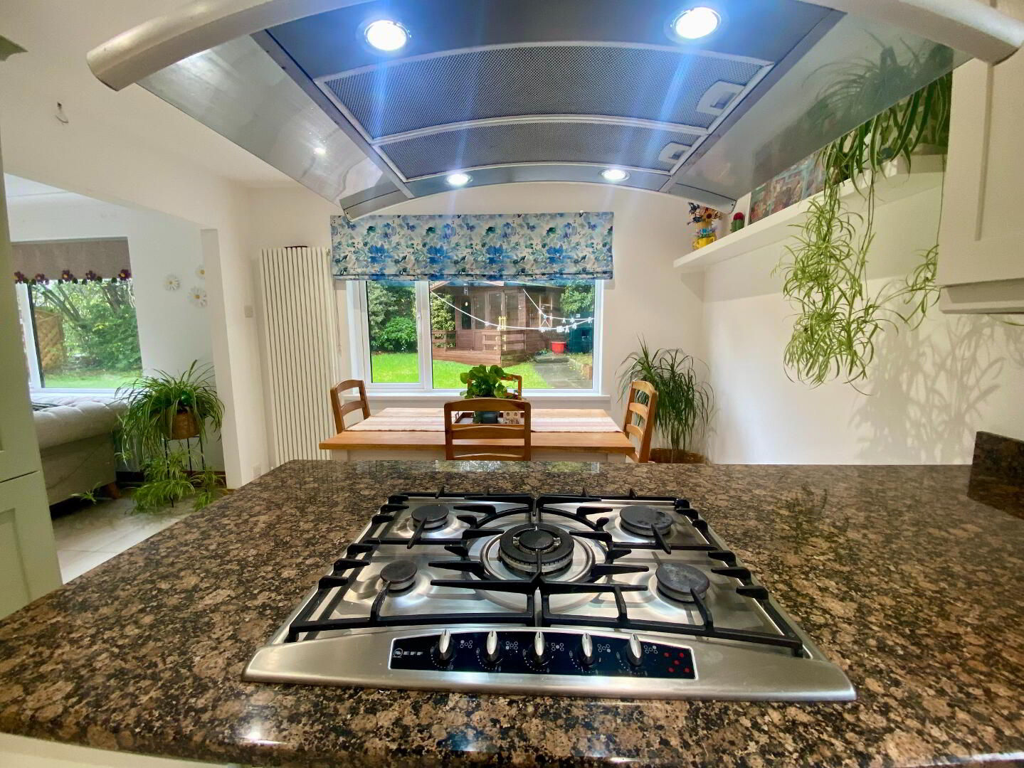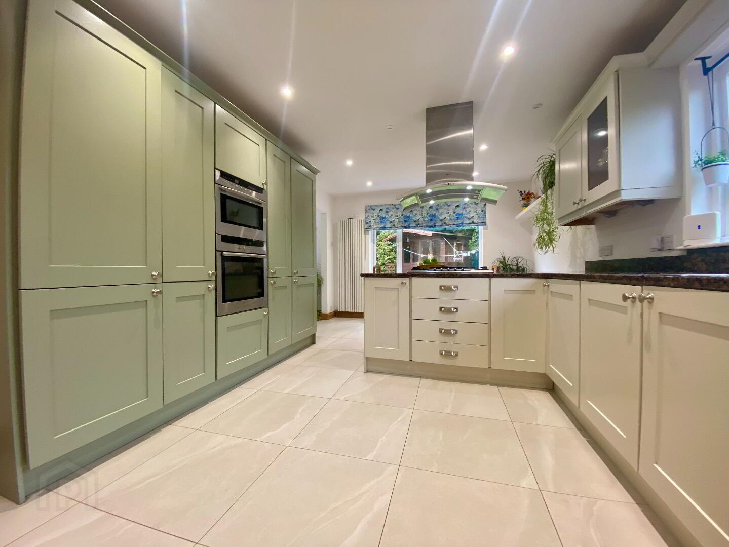 Fitted in a range of high and low level Sage fronted units with contrasting work surfaces, inlaid 1½ bowl stainless steel sink unit with mixer tap, integrated eye level ovens, gas hob and stainless steel extractor fan, integrated fridge/freezer and dishwasher, tiled flooring, window and door to enclosed rear.