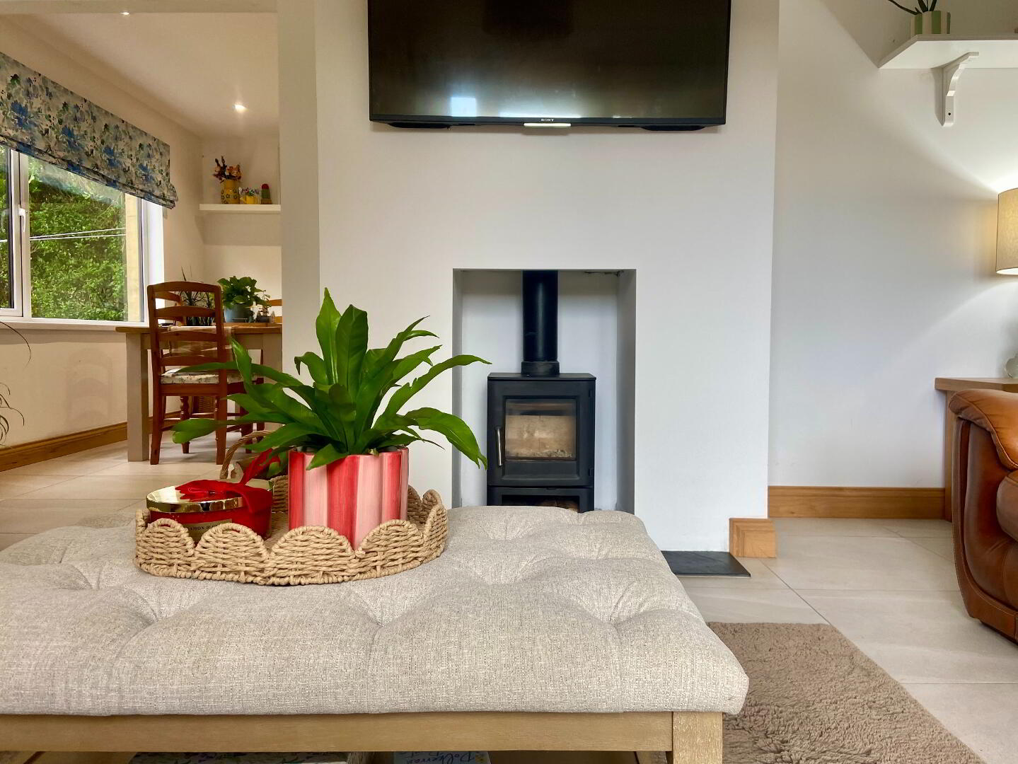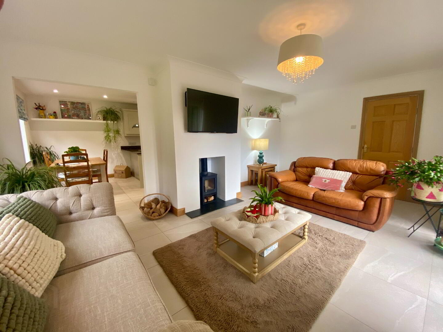 Lounge with feature wood burning stove and solid wood flooring plus PVC patio doors to enclosed rear garden