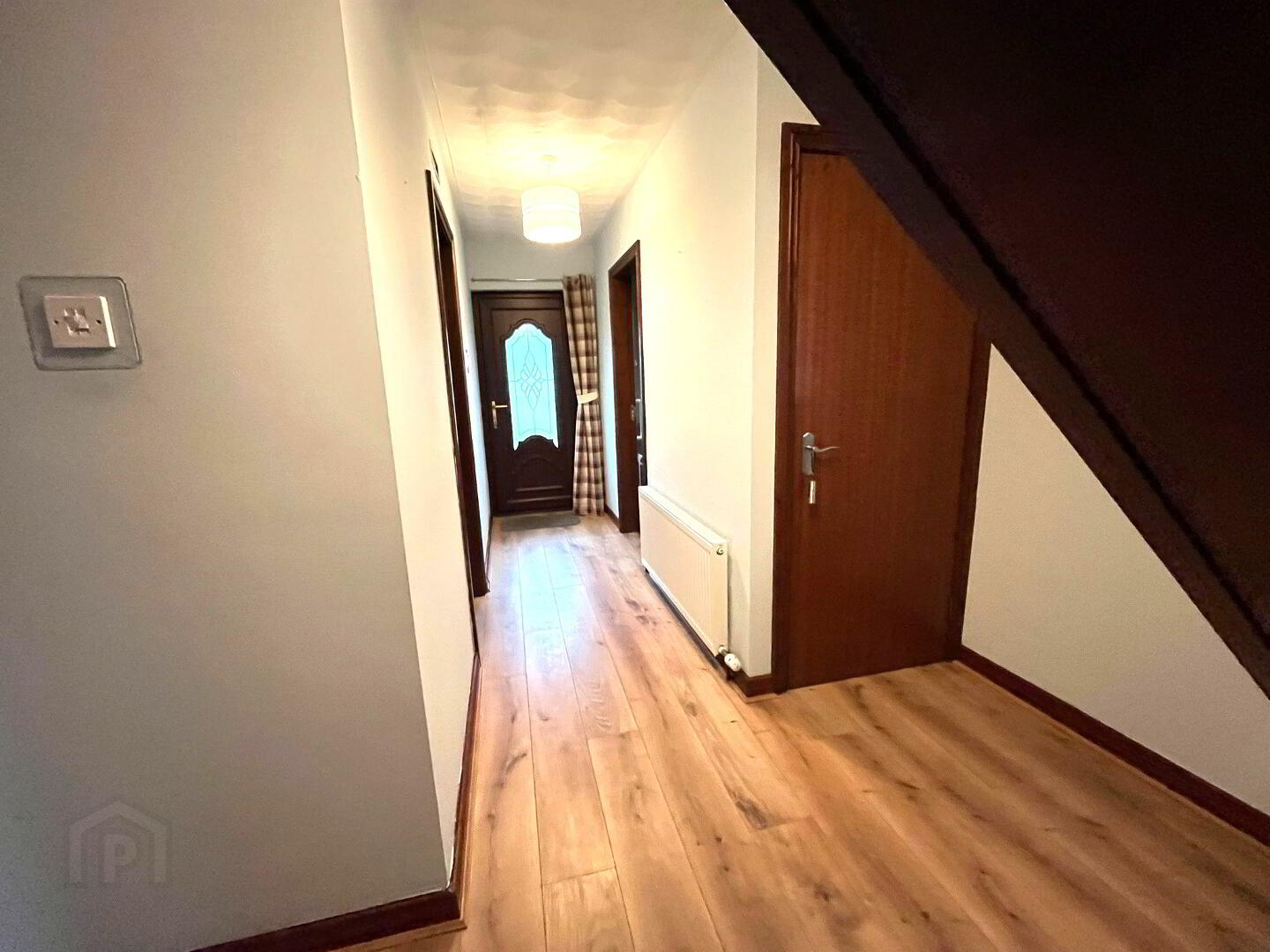 PVC entrance door, wooden laminate flooring, stairs to first floor.