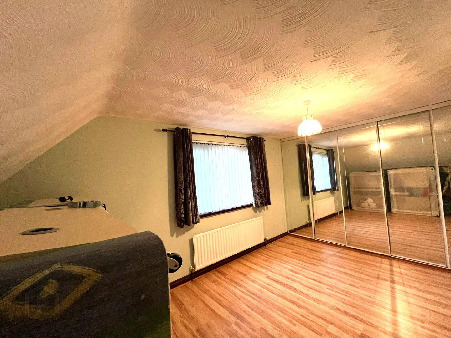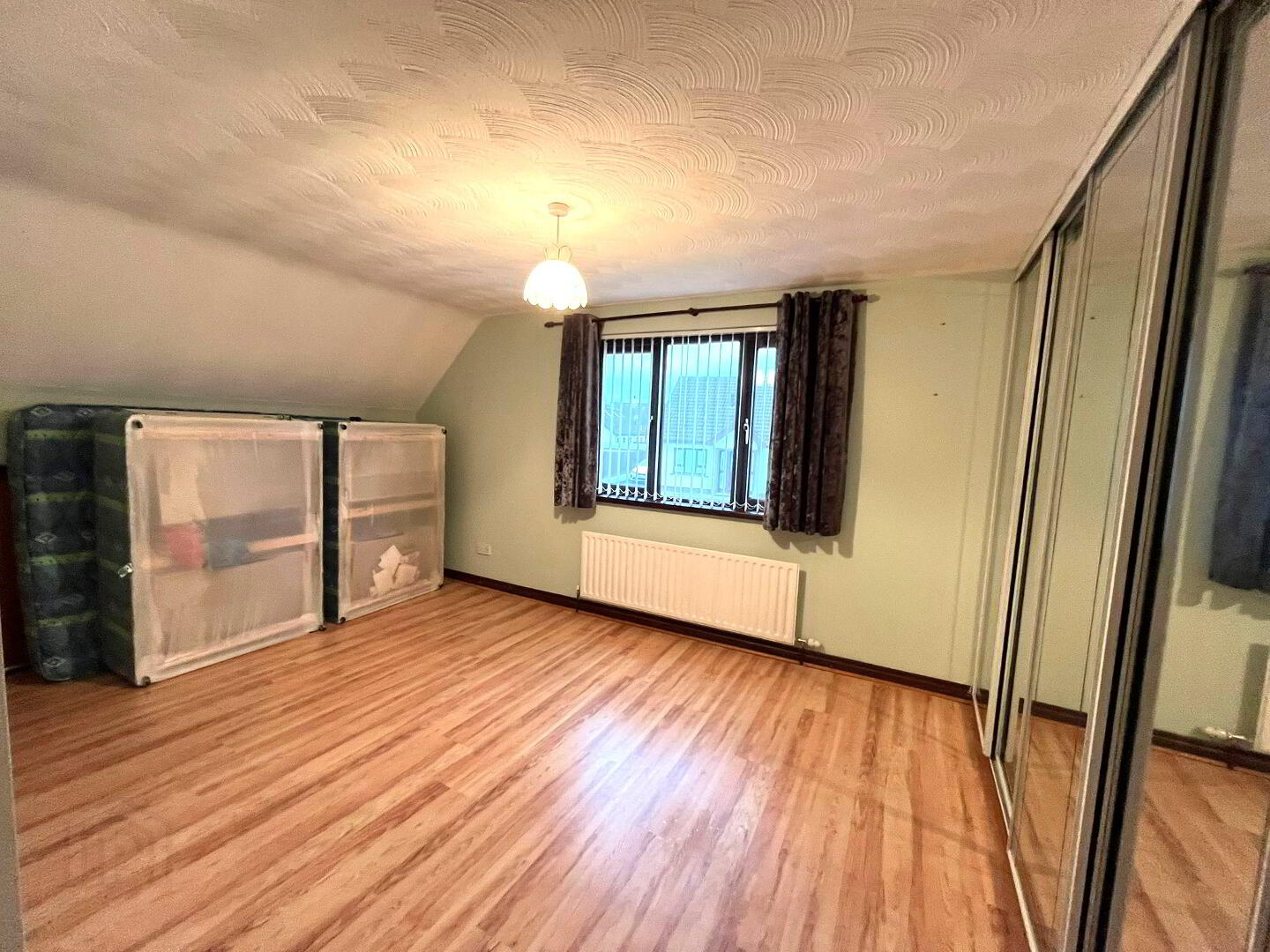Window to front aspect, wooden laminate flooring, eaves storage, fitted mirrored slide robes.