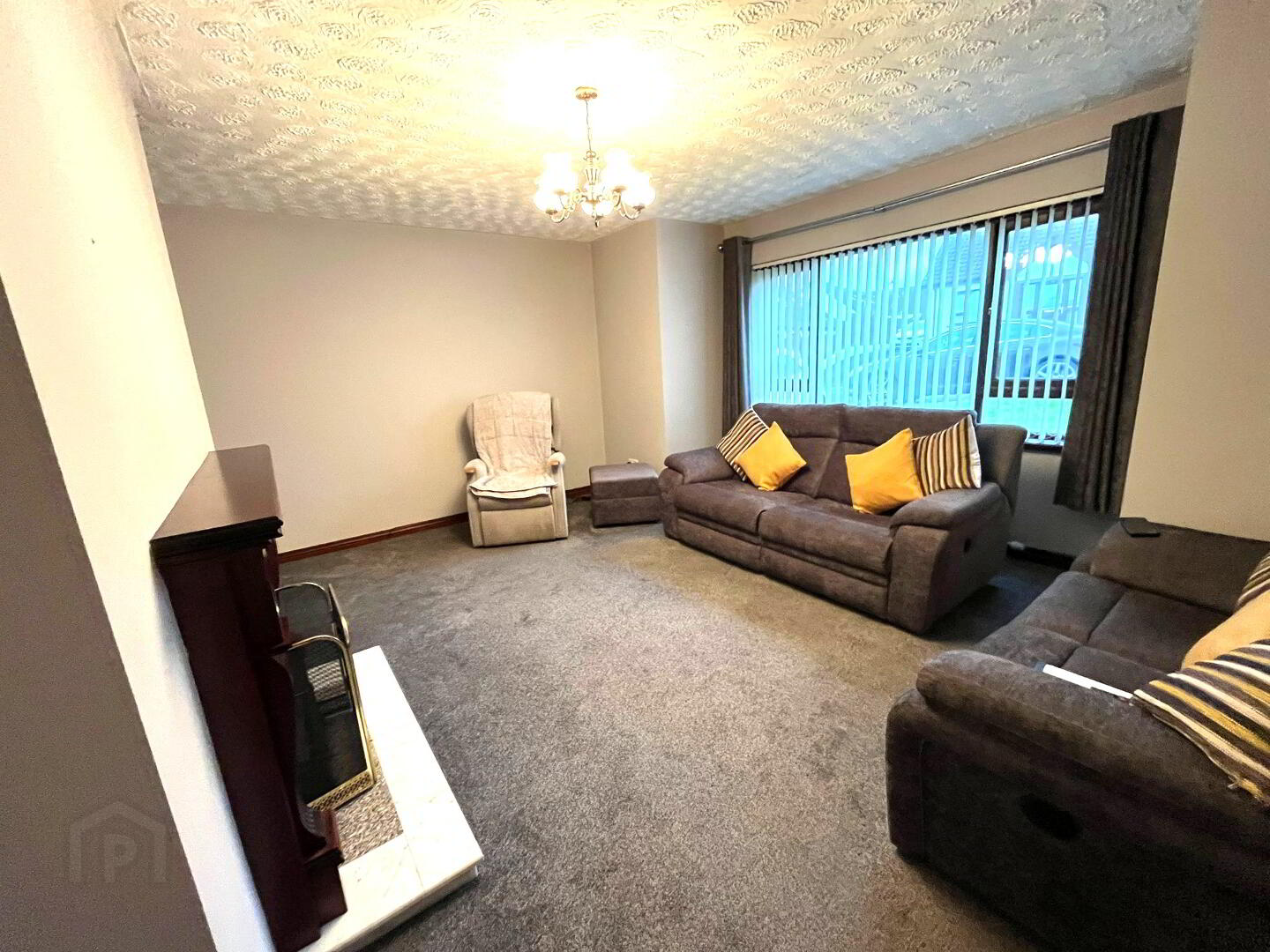 Feature fireplace with wooden surround and open fire, bay window to front aspect, carpeted.