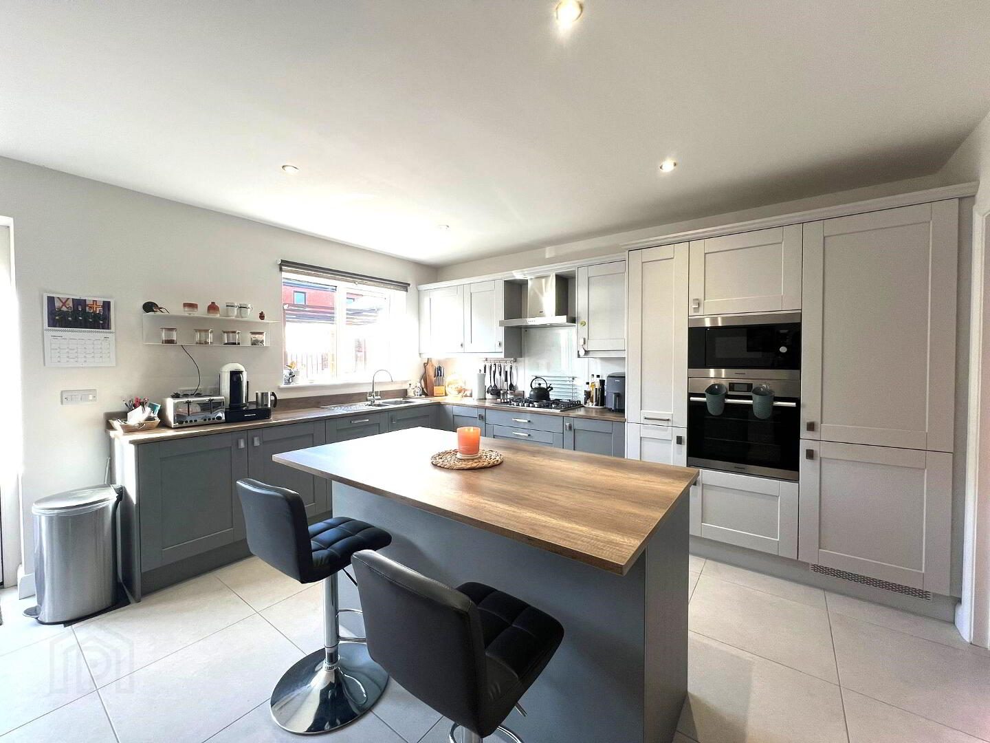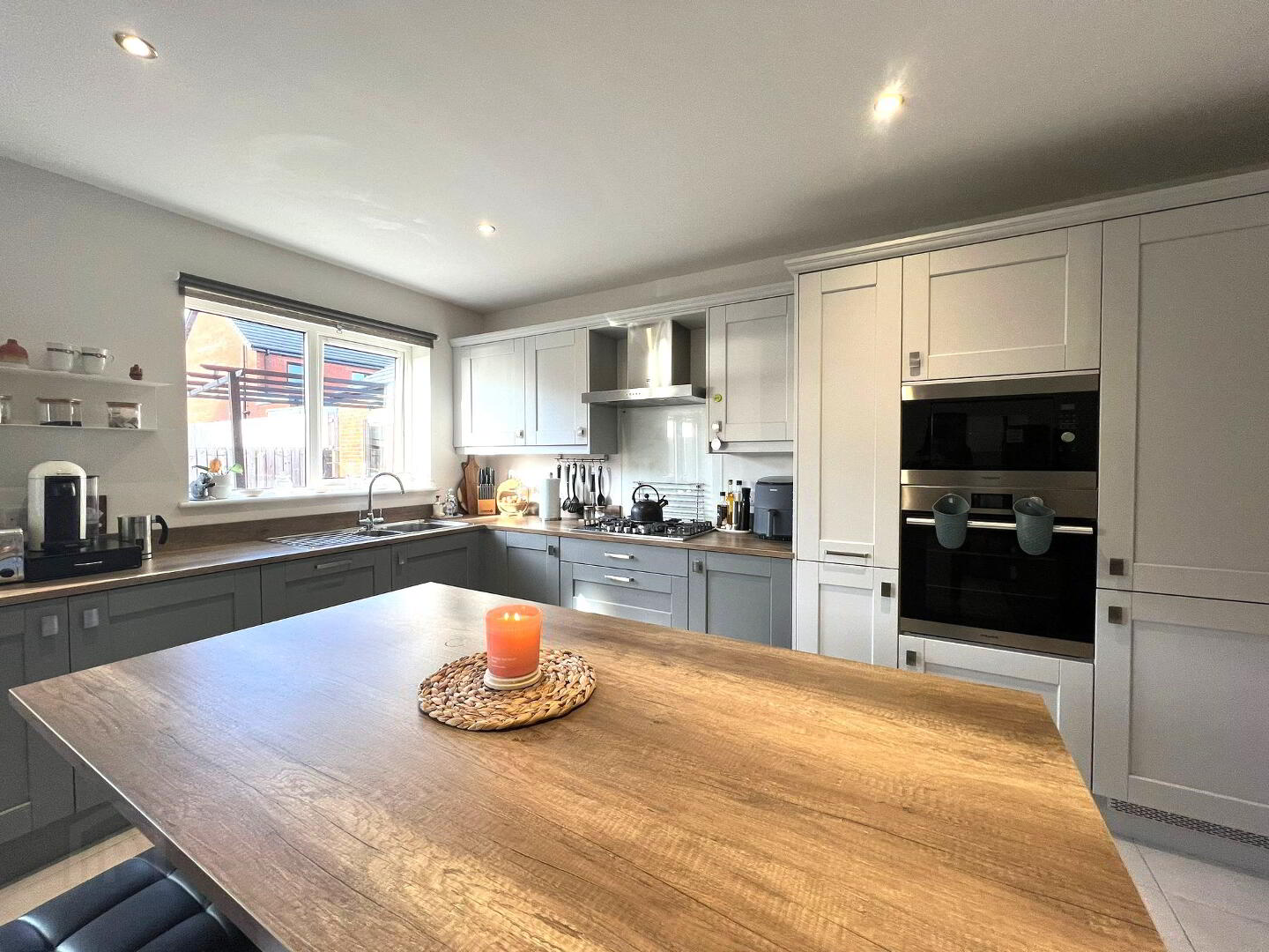 Fitted in a range of high and low level units with contrasting work surfaces, inlaid 1½ bowl stainless steel sink unit with mixer tap, integrated oven, stainless steel 5 ring gas hob unit, integrated microwave, dishwasher and fridge/freezer, island unit, window to rear, PVC patio doors to enclosed rear, tiled flooring.