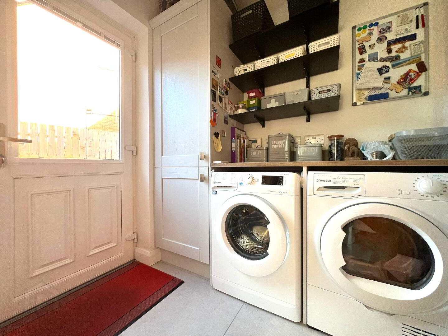 Fitted in a range of low level units with contrasting work surfaces, plumbed for washing machine, PVC door to side aspect, tiled flooring.