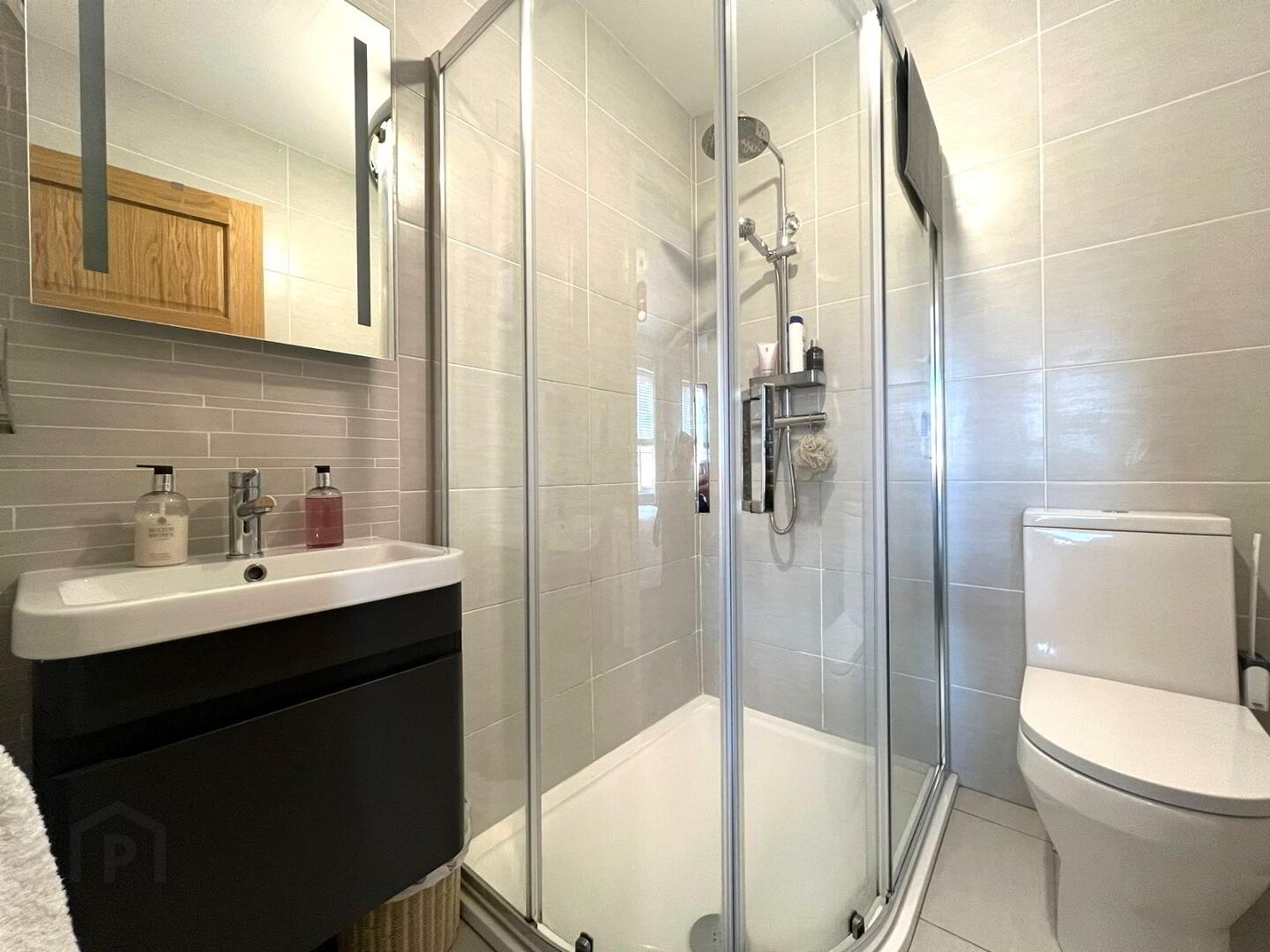 White suite comprising shower cubicle, wash hand basin with mixer tap, low flush WC, fully tiled walls, tiled flooring.
