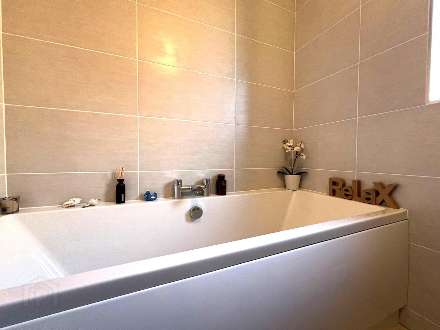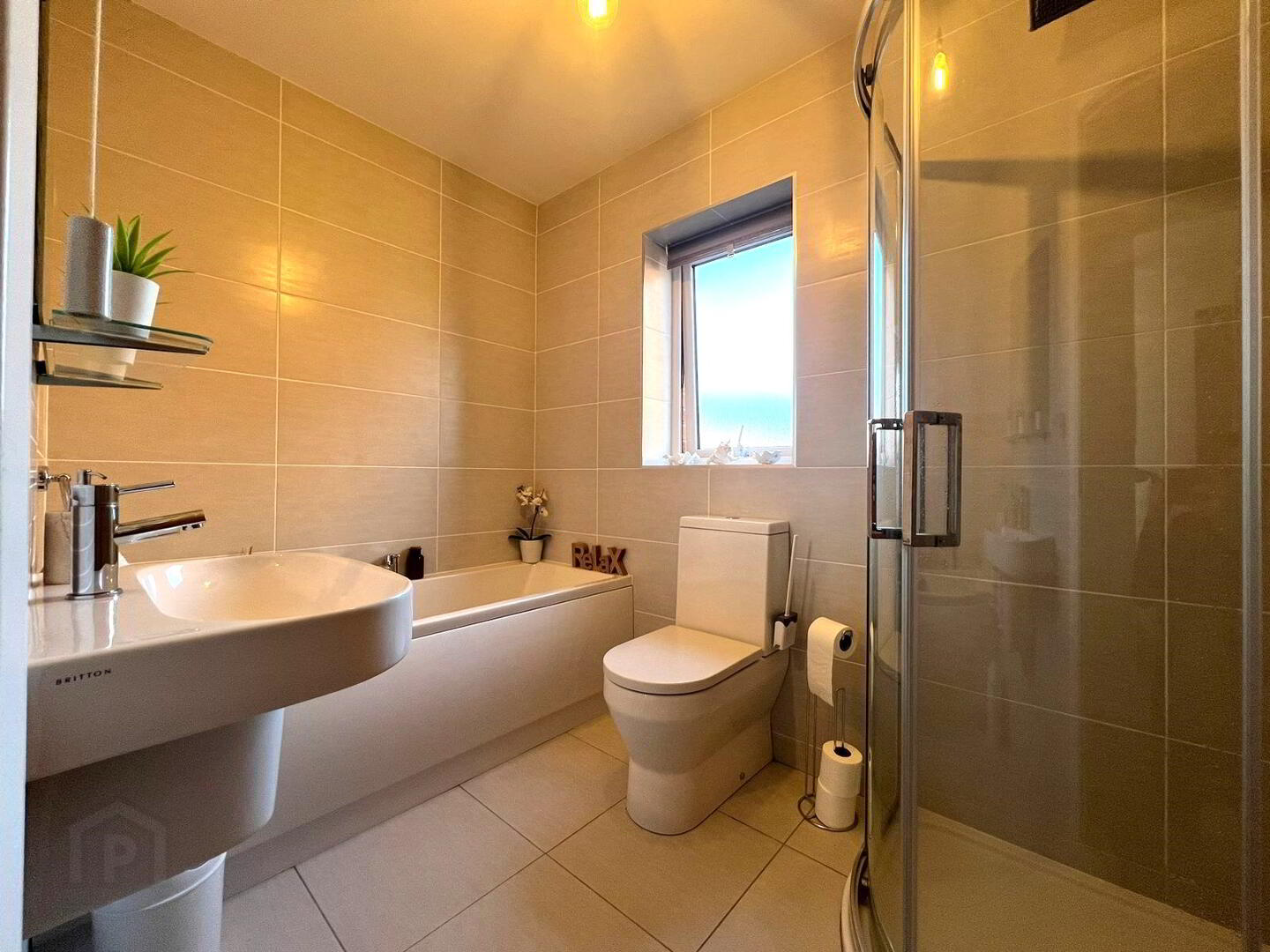 White 4 piece suite comprising panelled bath with centralised mixer tap, separate fully tiled shower cubicle, wash hand basin with mixer tap, low flush WC, window to side aspect, fully tiled walls, tiled flooring.