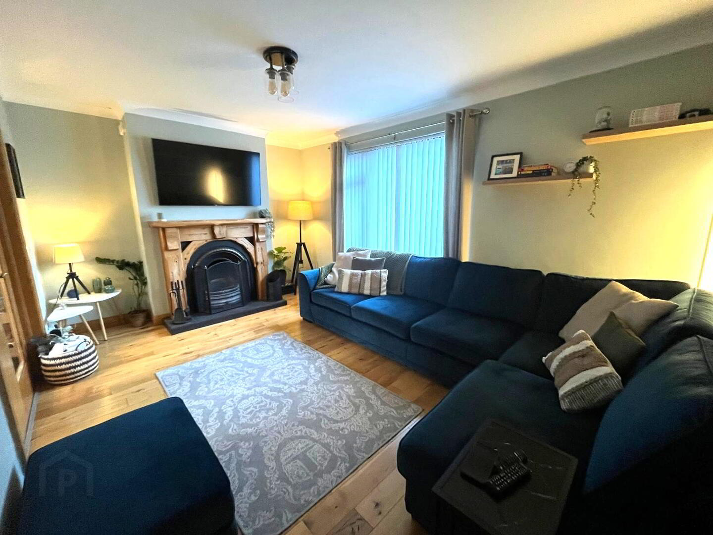 Feature fireplace with slate hearth, pine solid wood flooring, window to front aspect.