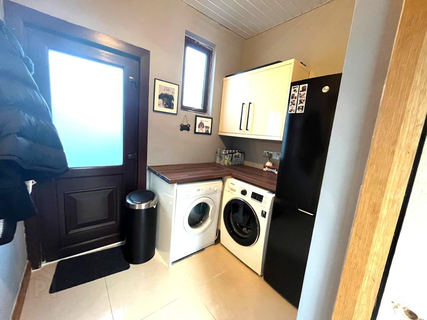 Plumbed for washing machine/tumble dryer, recess for fridge, storage cupboards, porcelain tiled flooring, window and PVC door to front and rear aspect.