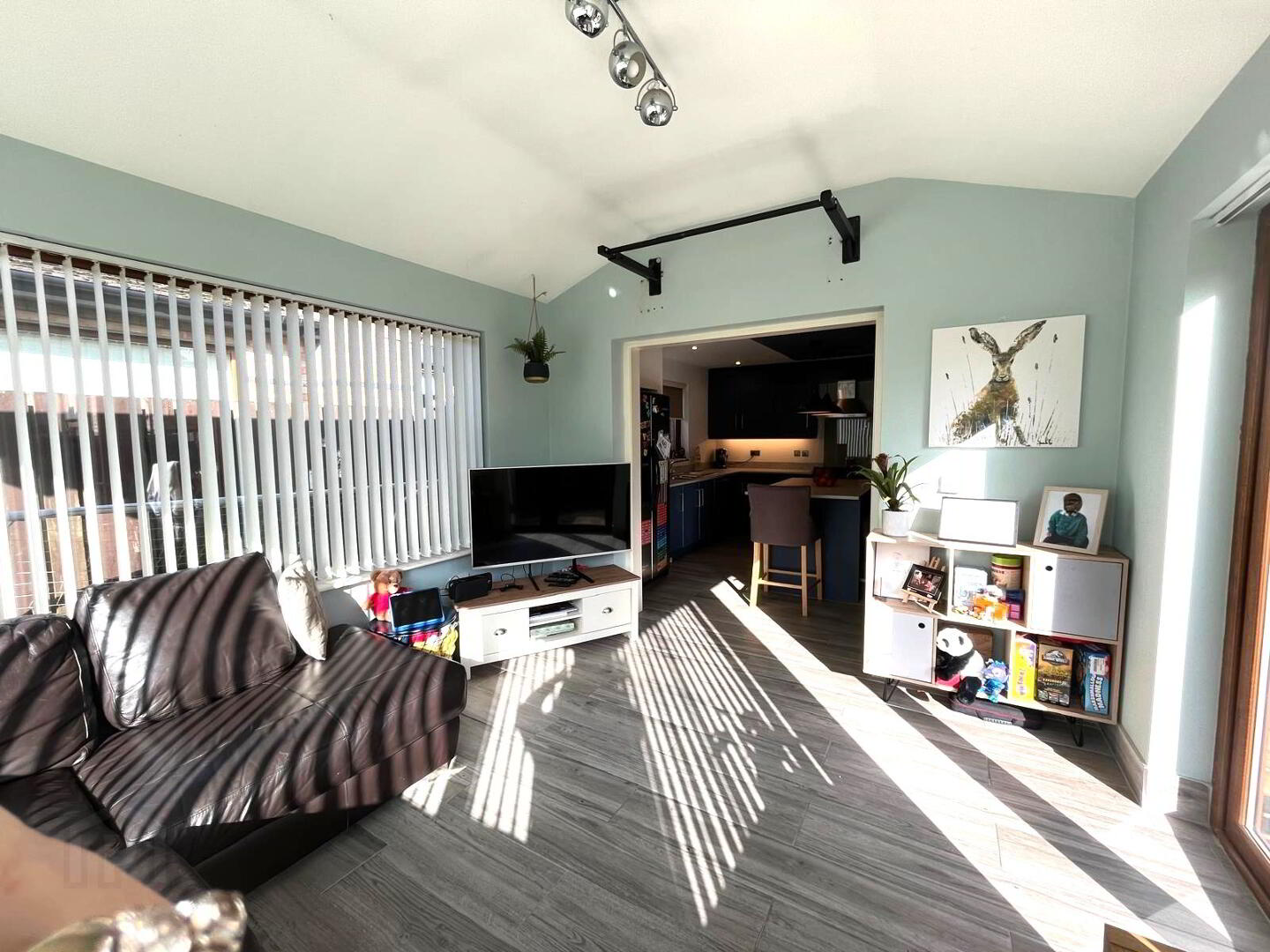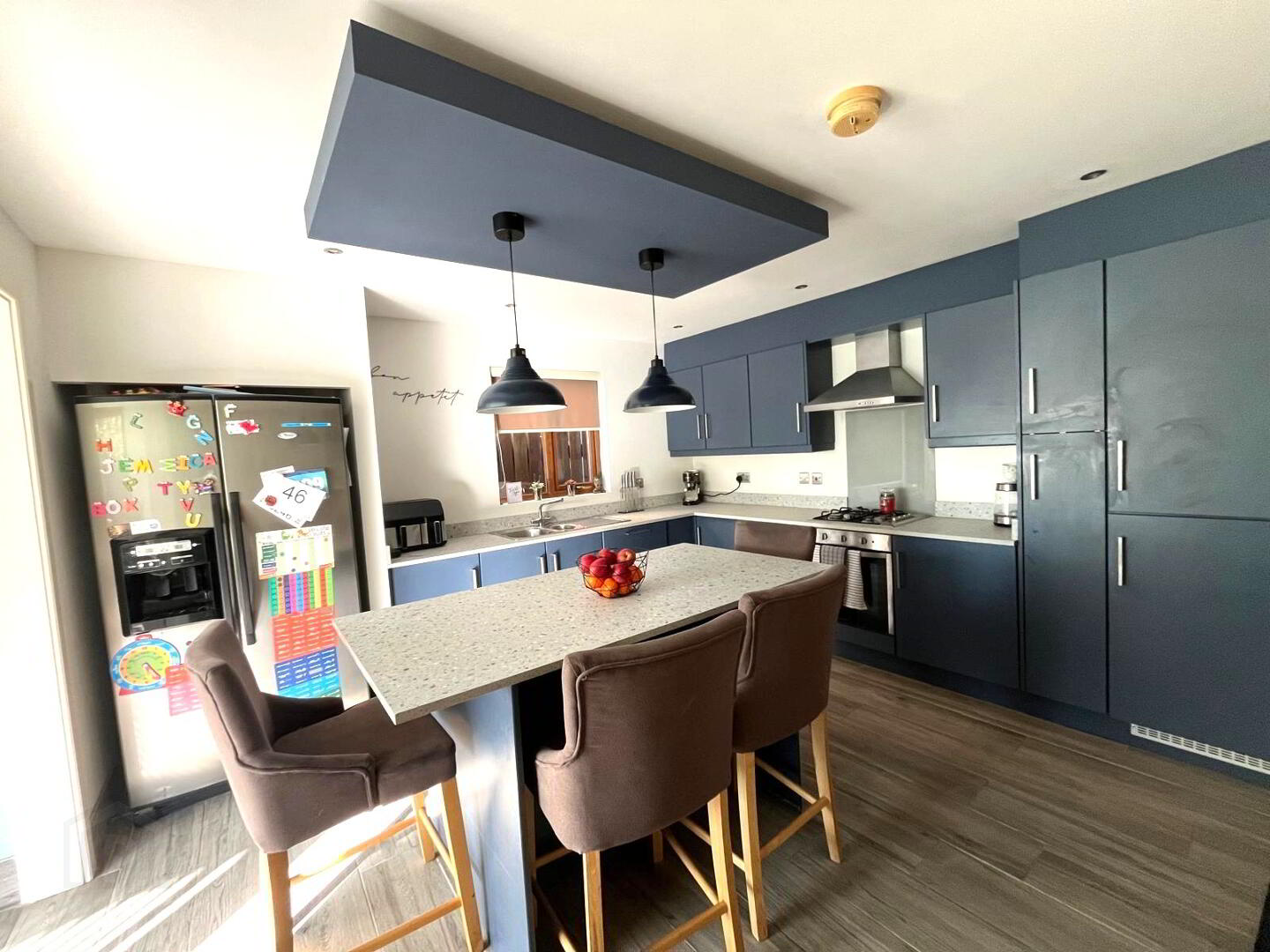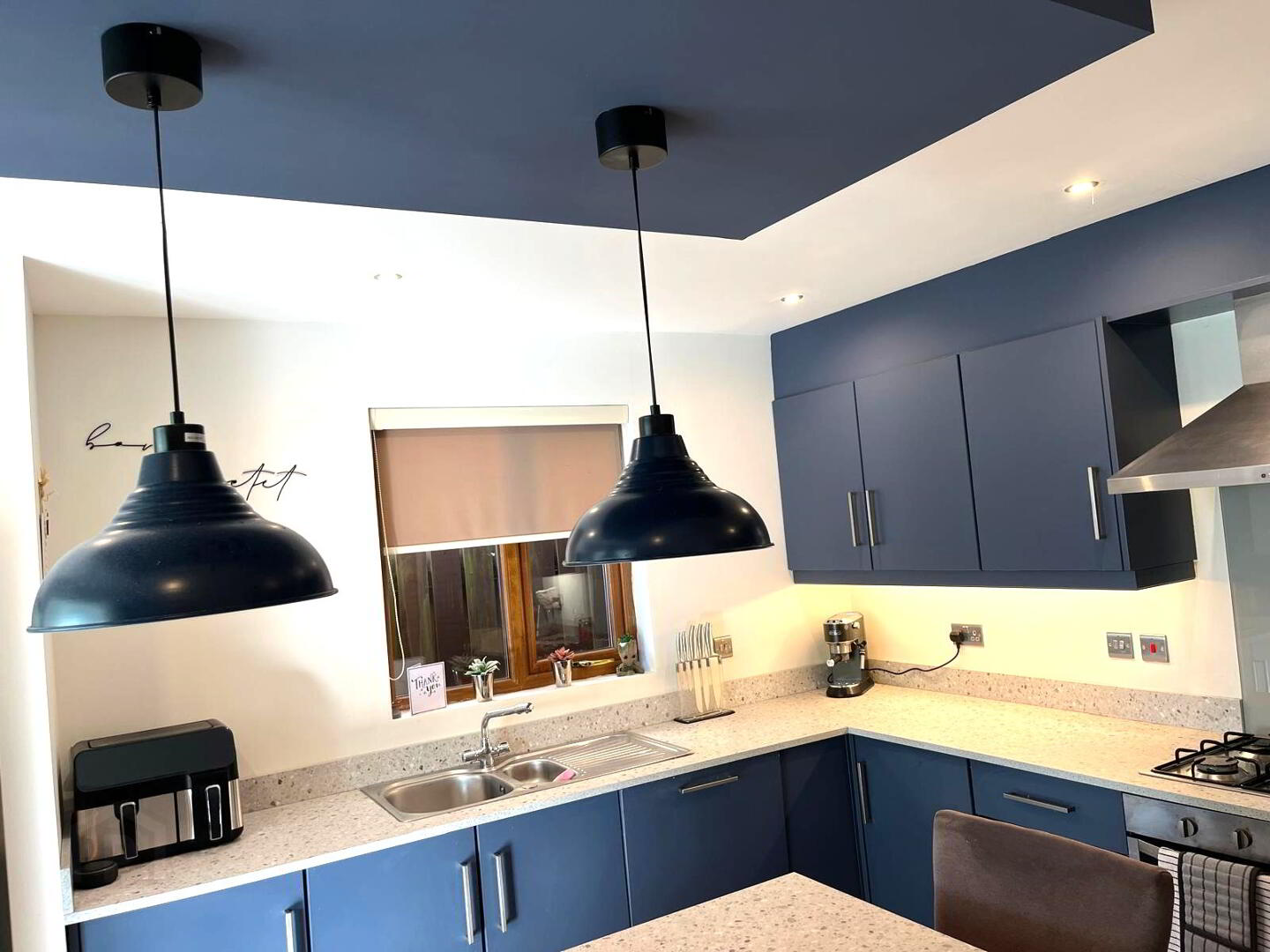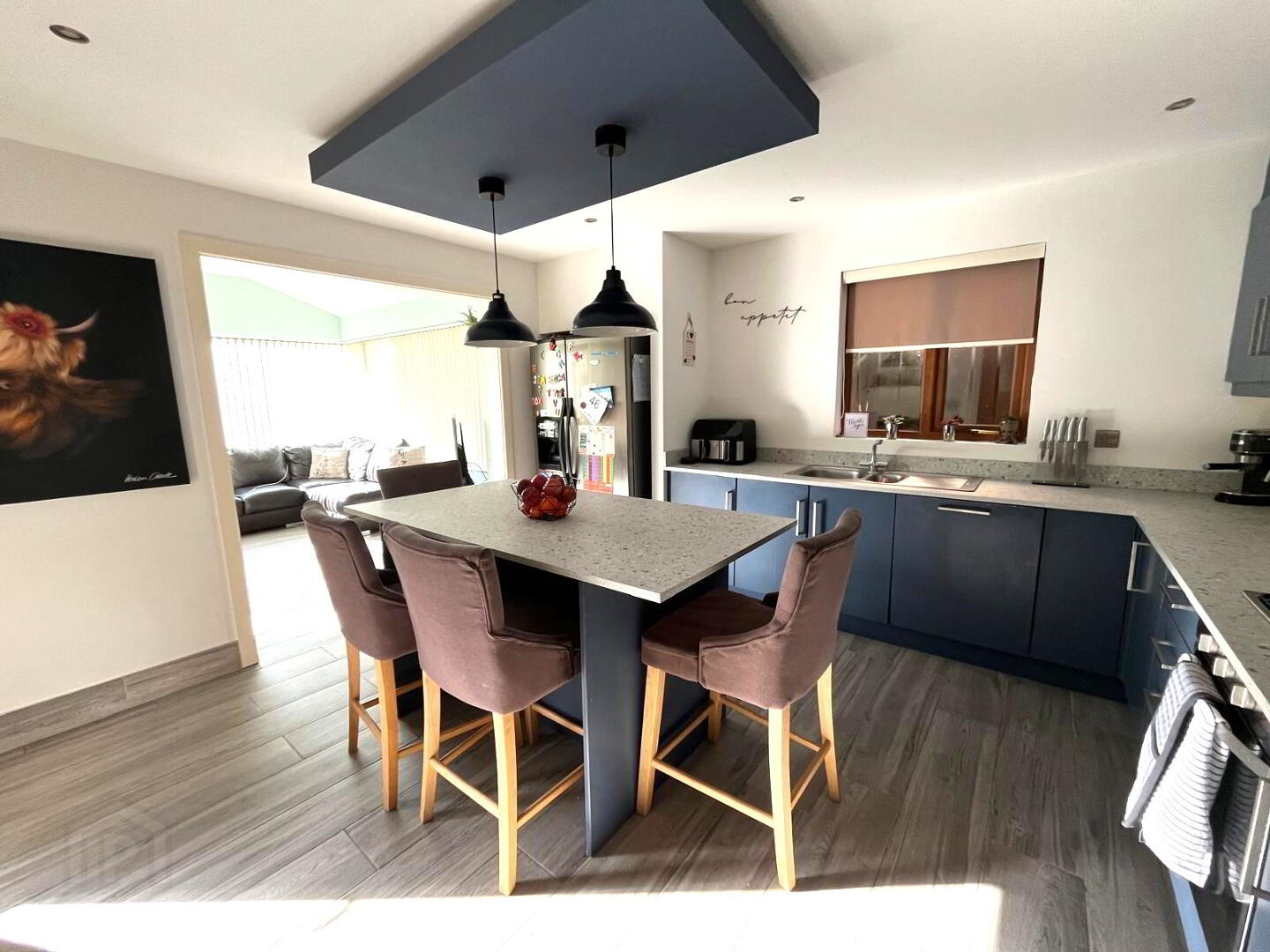 Fitted in a range of high and low level Navy units with contrasting laminate work surfaces, integrated oven, hob and extractor fan, integrated dishwasher, inlaid 1½ bowl stainless steel sink unit with mixer tap, ceramic tiled flooring, window to side aspect, open to sunroom.