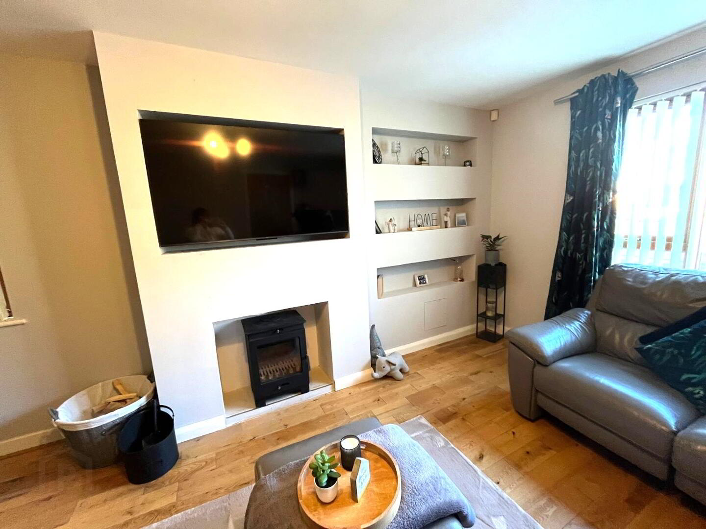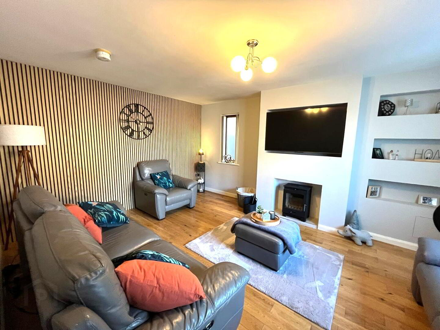 Feature wood burning stove, solid wood flooring, window to front and side aspects, feature panelled wall.