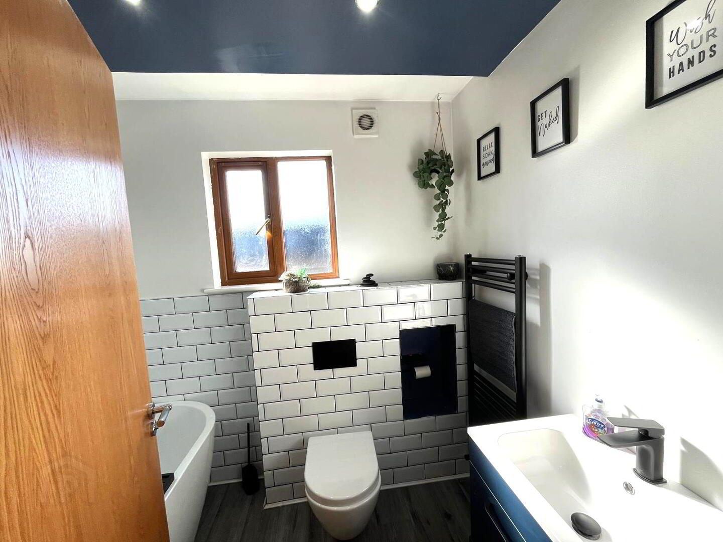 White suite comprising free standing bath, vanity wash hand basin with mixer tap, wall hung WC, window to rear aspect, tiled flooring, part tiled walls, laminate wood flooring.