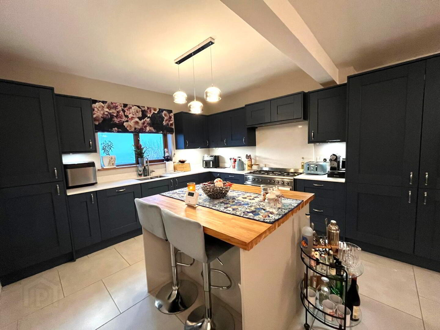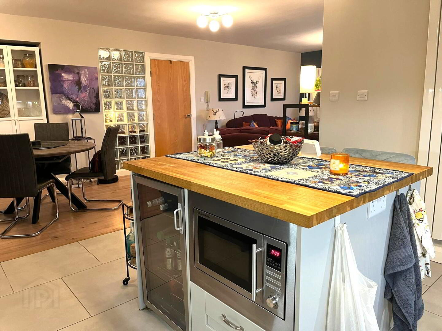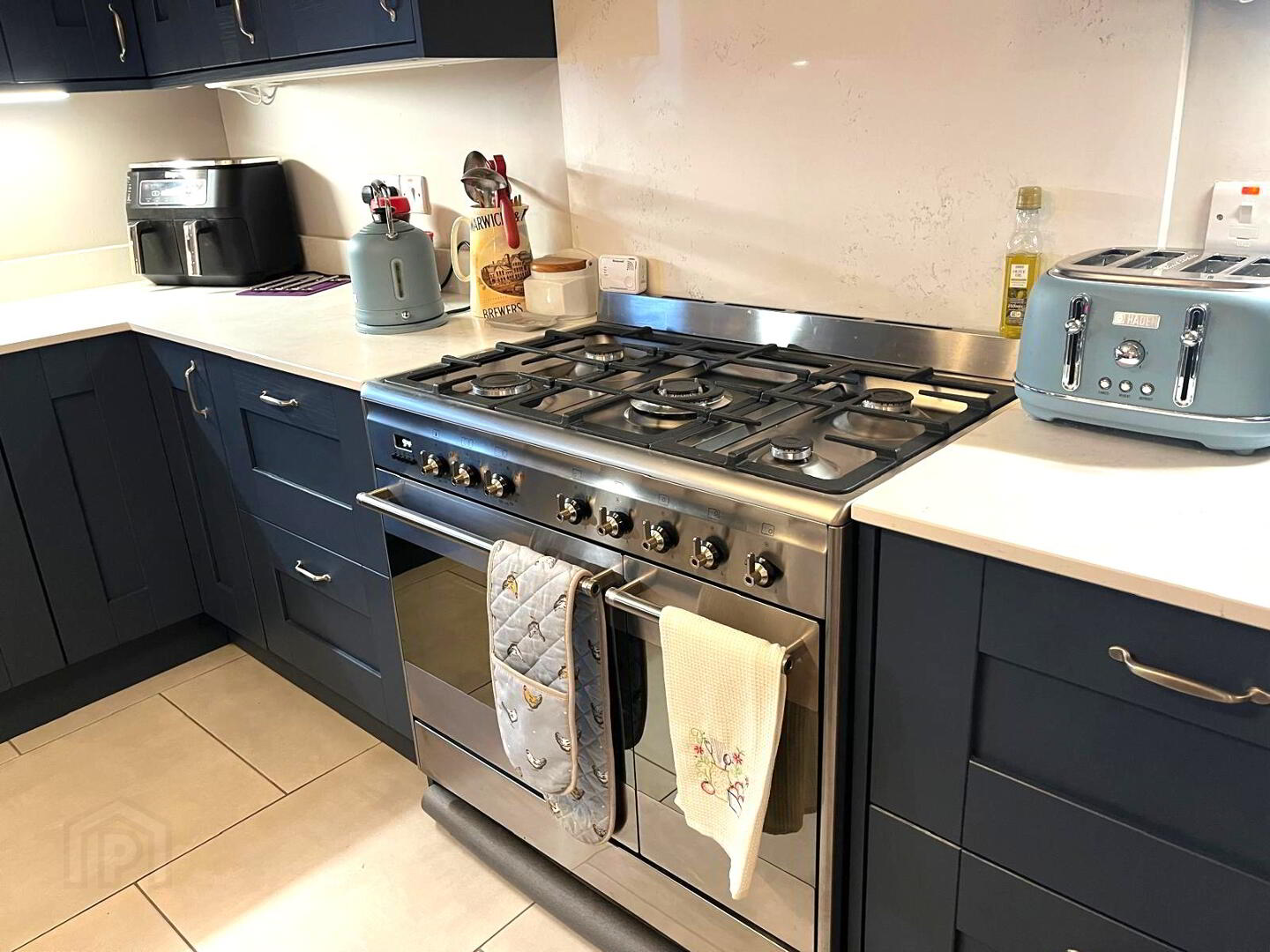Fitted in a range of high and low level units with contrasting laminate work surfaces, inlaid single drainer sink unit with mixer tap, integrated microwave, gas hob/oven , integrated fridge and freezer, integrated dishwasher, windows and wooden door to front aspect, ceramic tiled flooring.