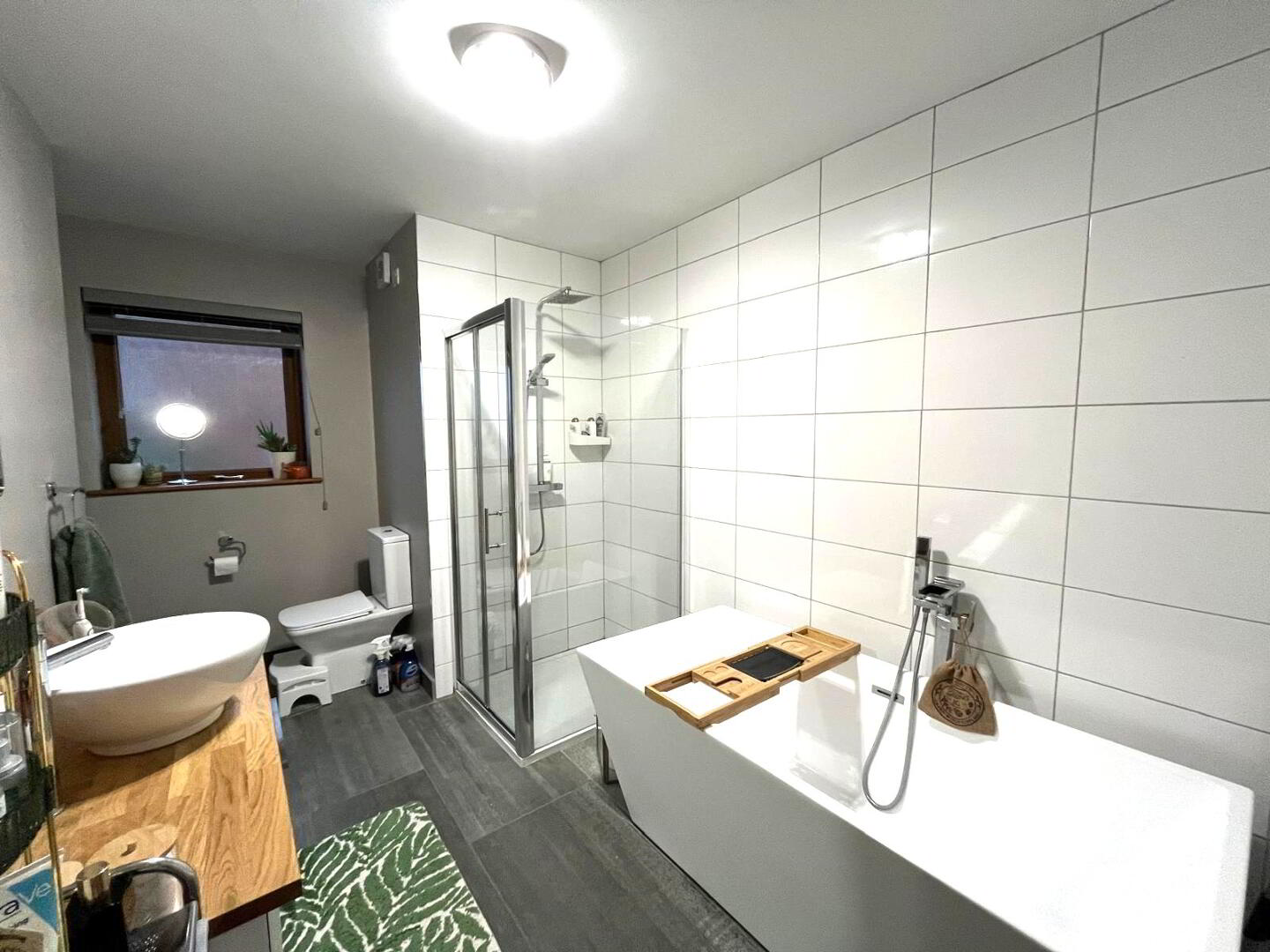White suite comprising of panelled bath with separate shower cubicle, low flush WC, wash hand basin with mixer tap, part tiled walls, tiled flooring, window to rear aspect.