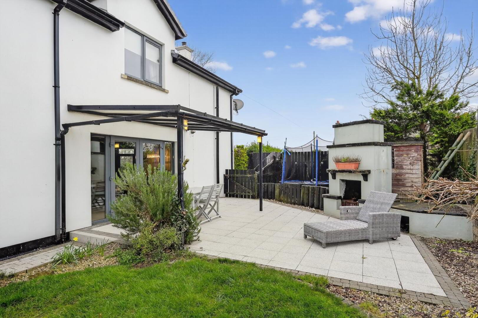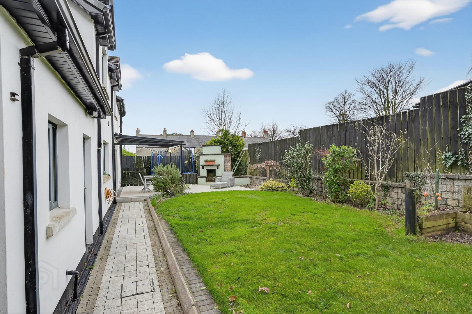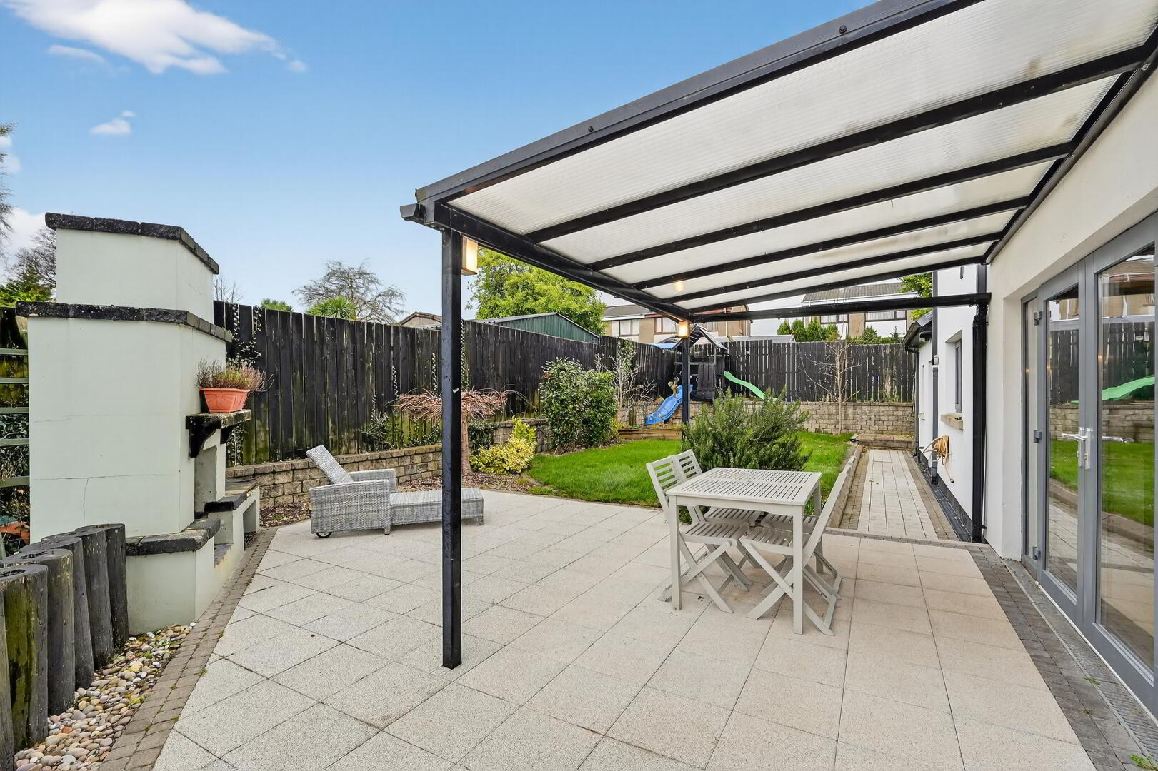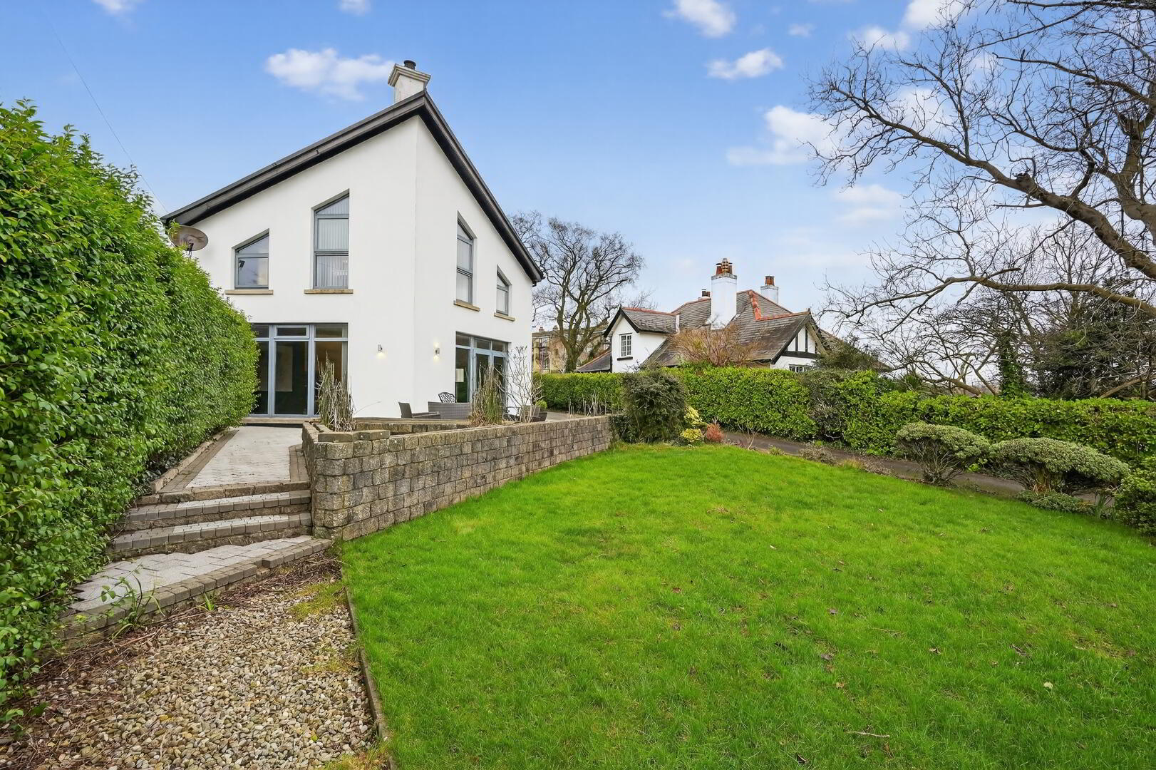 Fully enclosed rear laid in lawn bounded by hedging and fencing with paved patio areas
