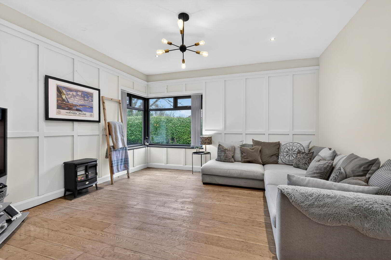 Multi fuel fire, windows and patio door to front garden, oak flooring.