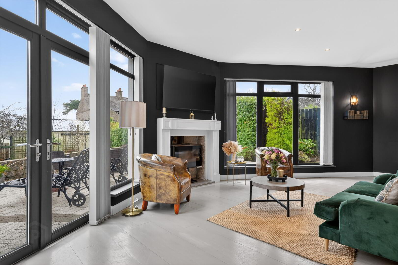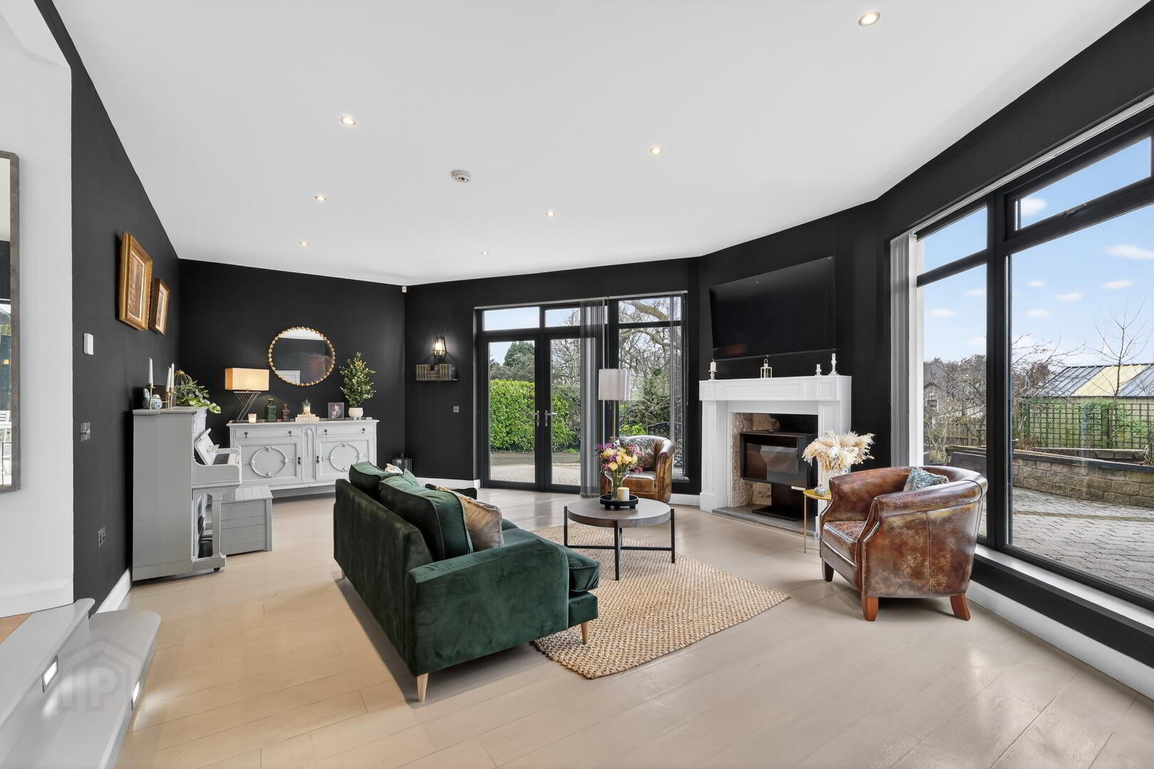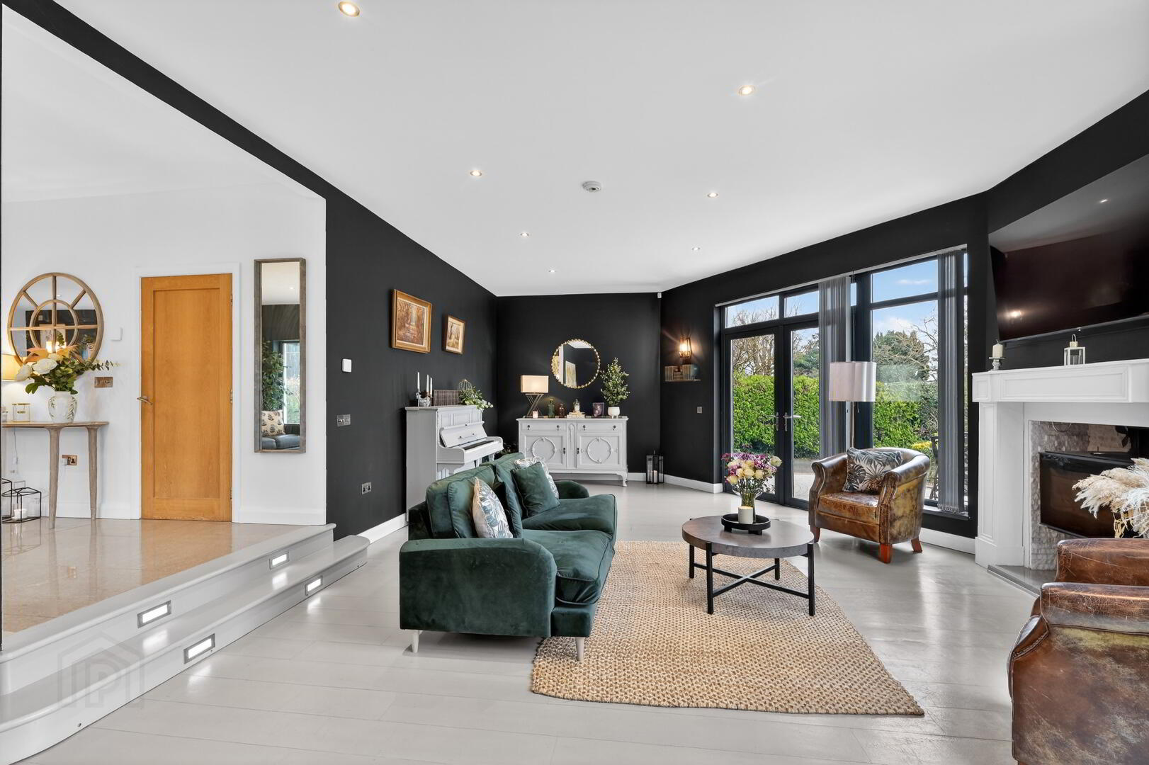 Lounge with feature fire and PVC patio door to front aspect