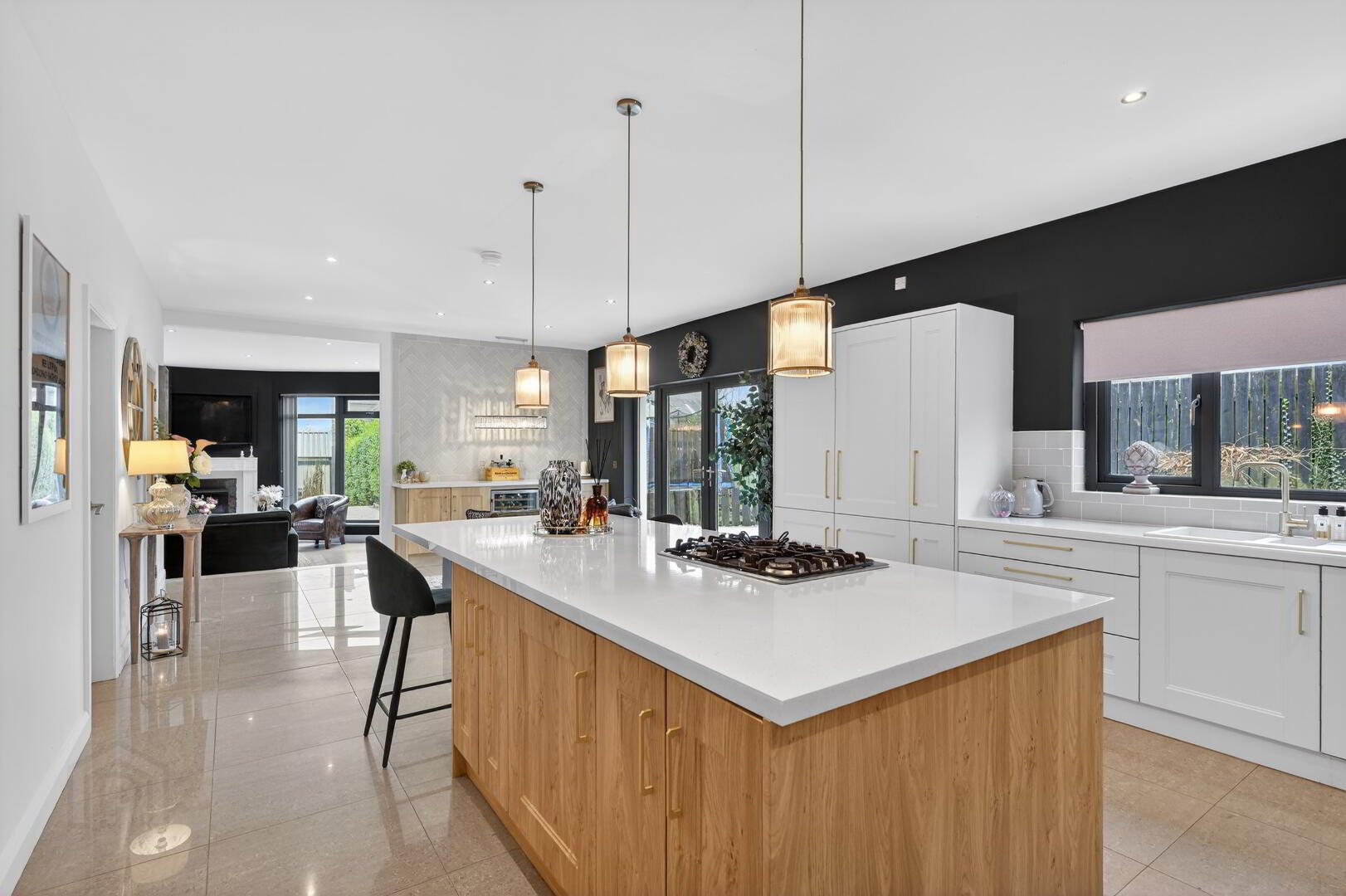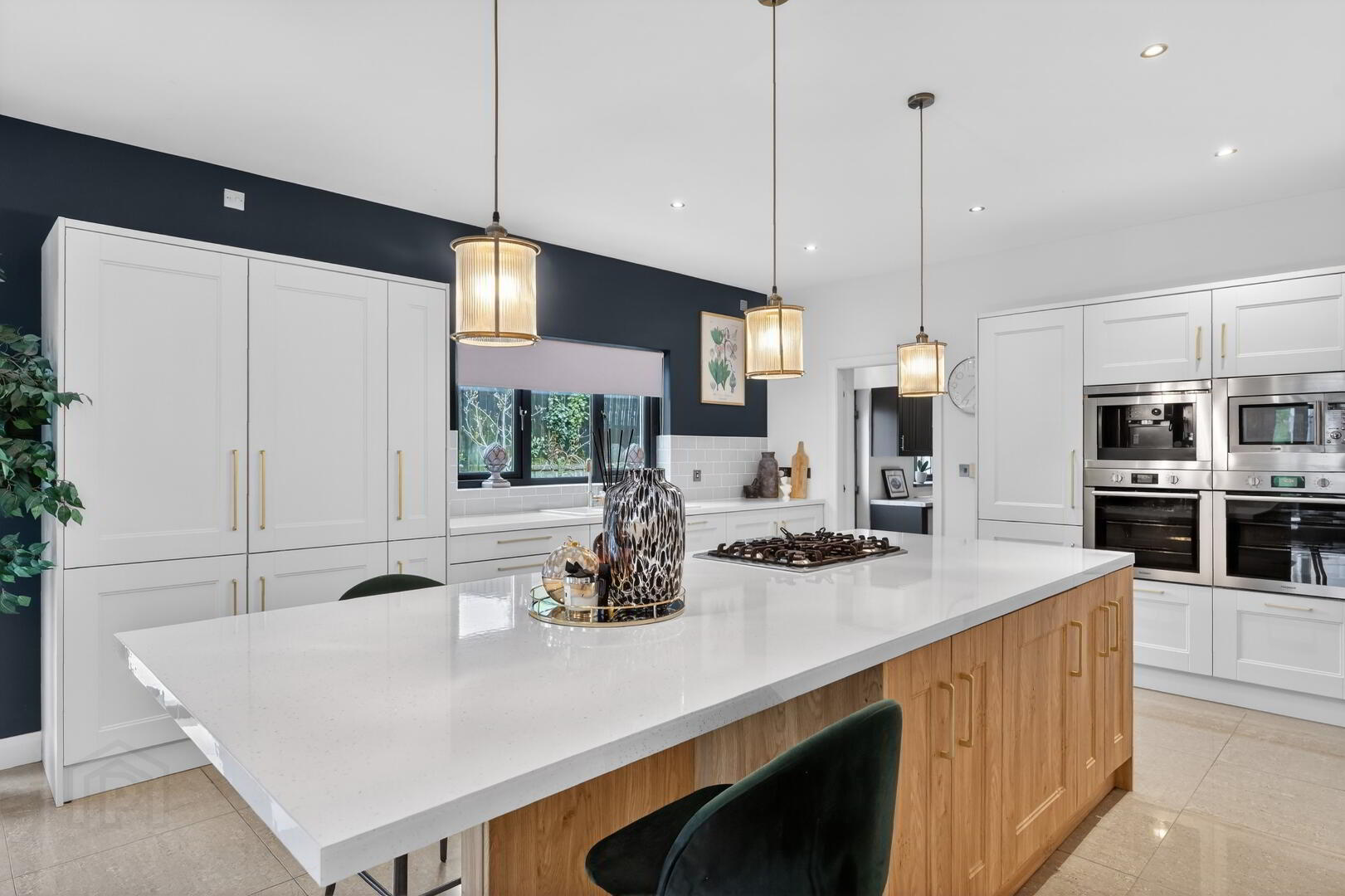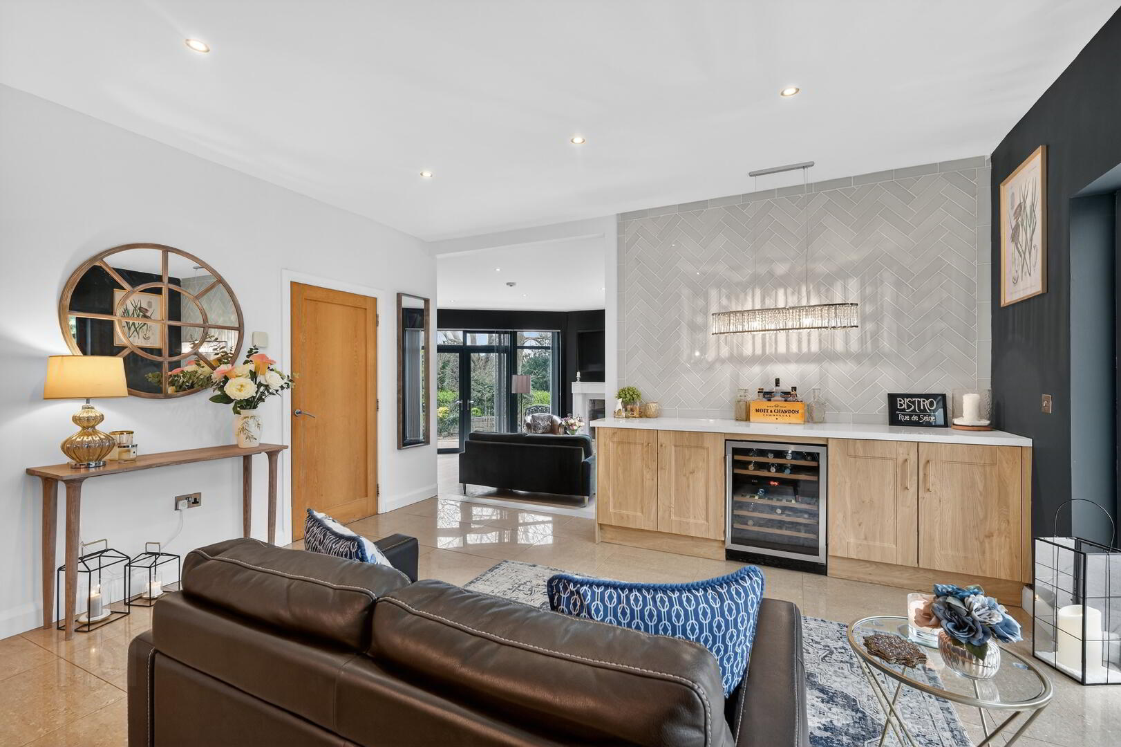 doors to enclosed rear garden, island unit with breakfast bar area, recess for wine fridge, tiled flooring.