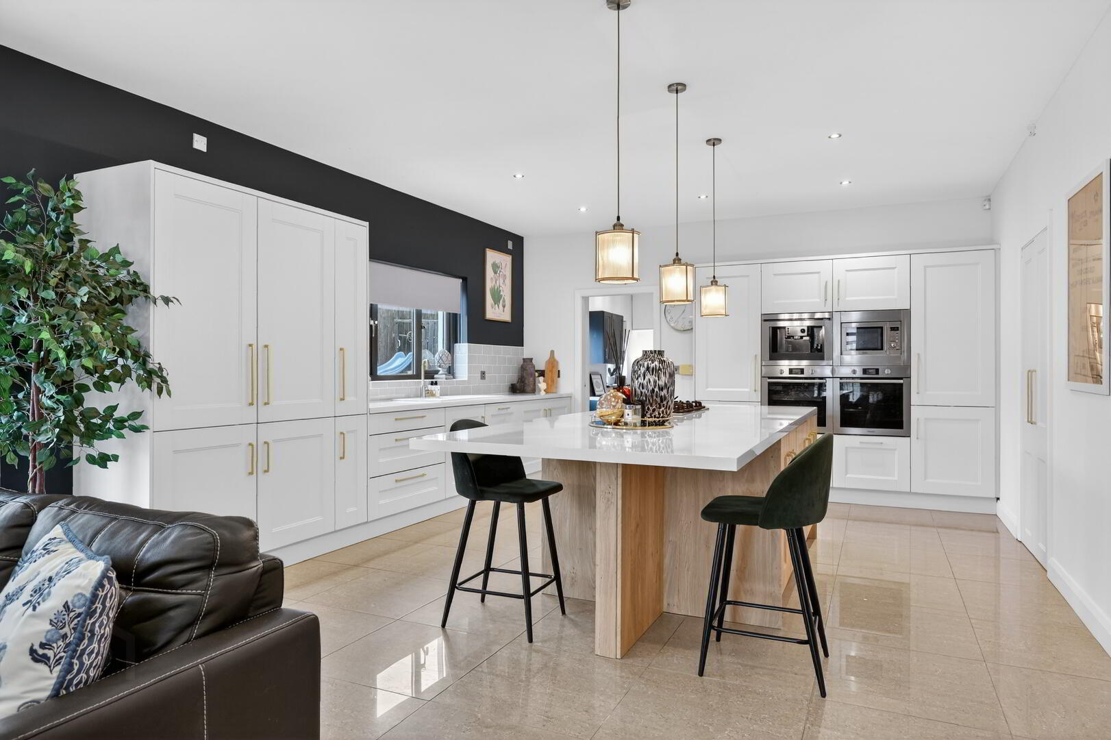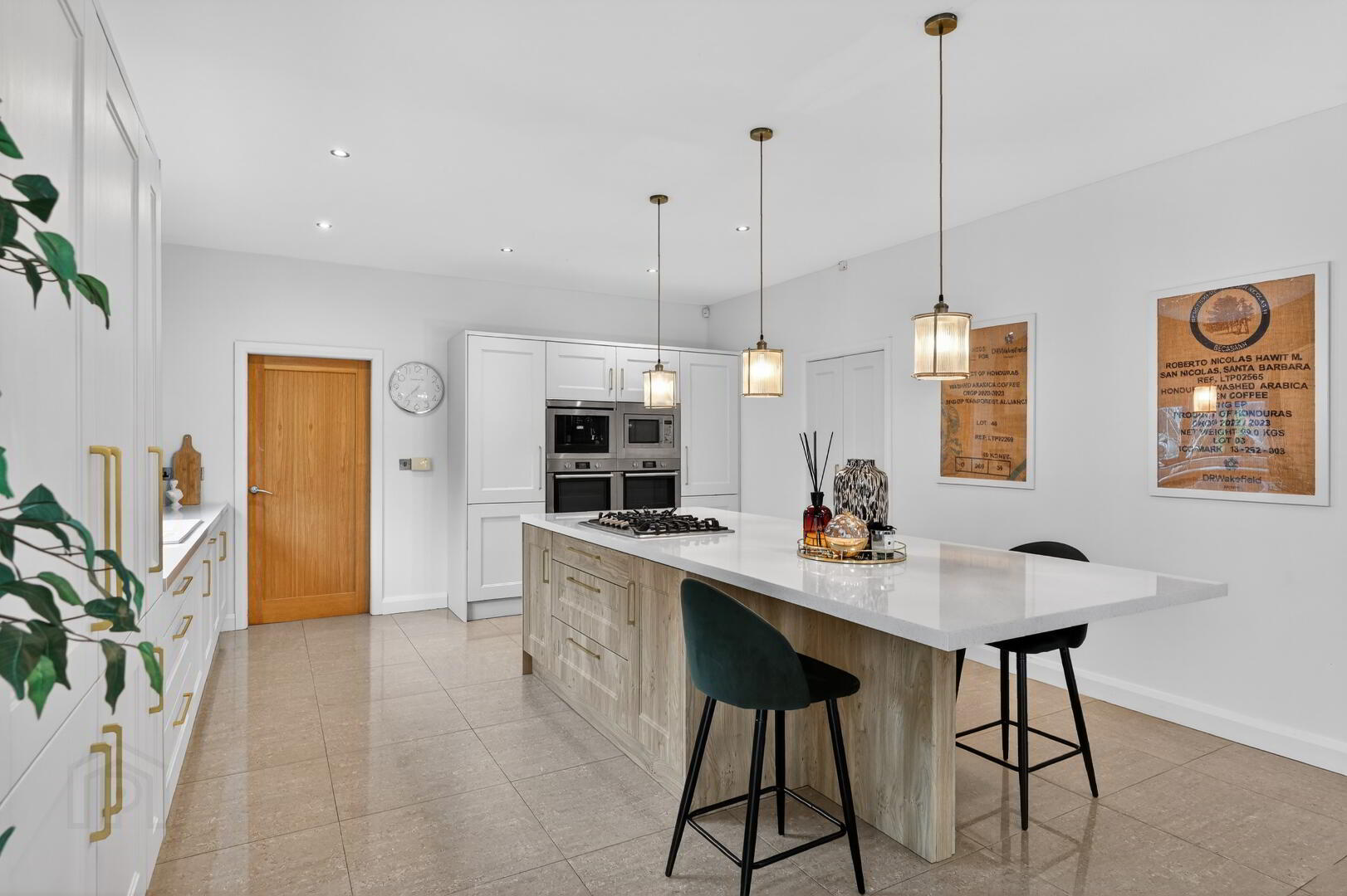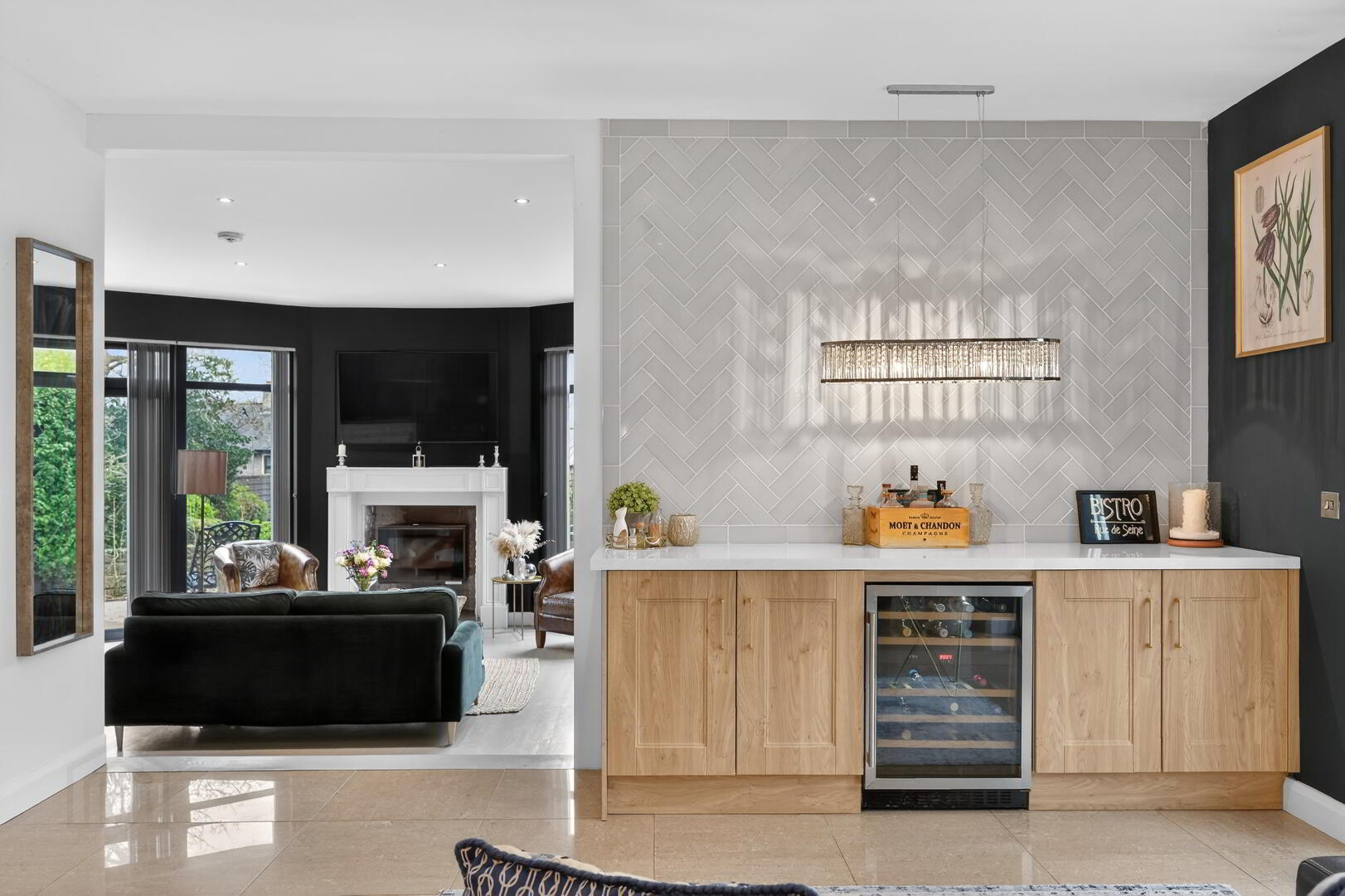 doors to enclosed rear garden, island unit with breakfast bar area, recess for wine fridge, tiled flooring.