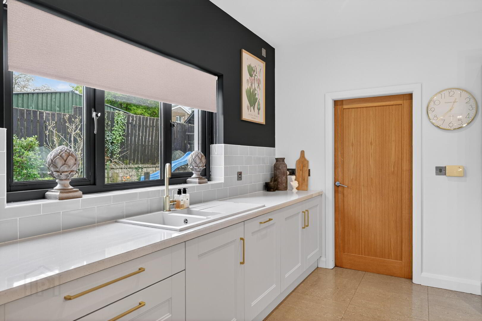 Fitted in a range of high and low level unit with contrasting work surfaces plus inlaid sink unit, window