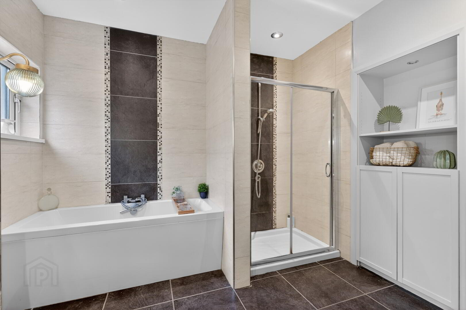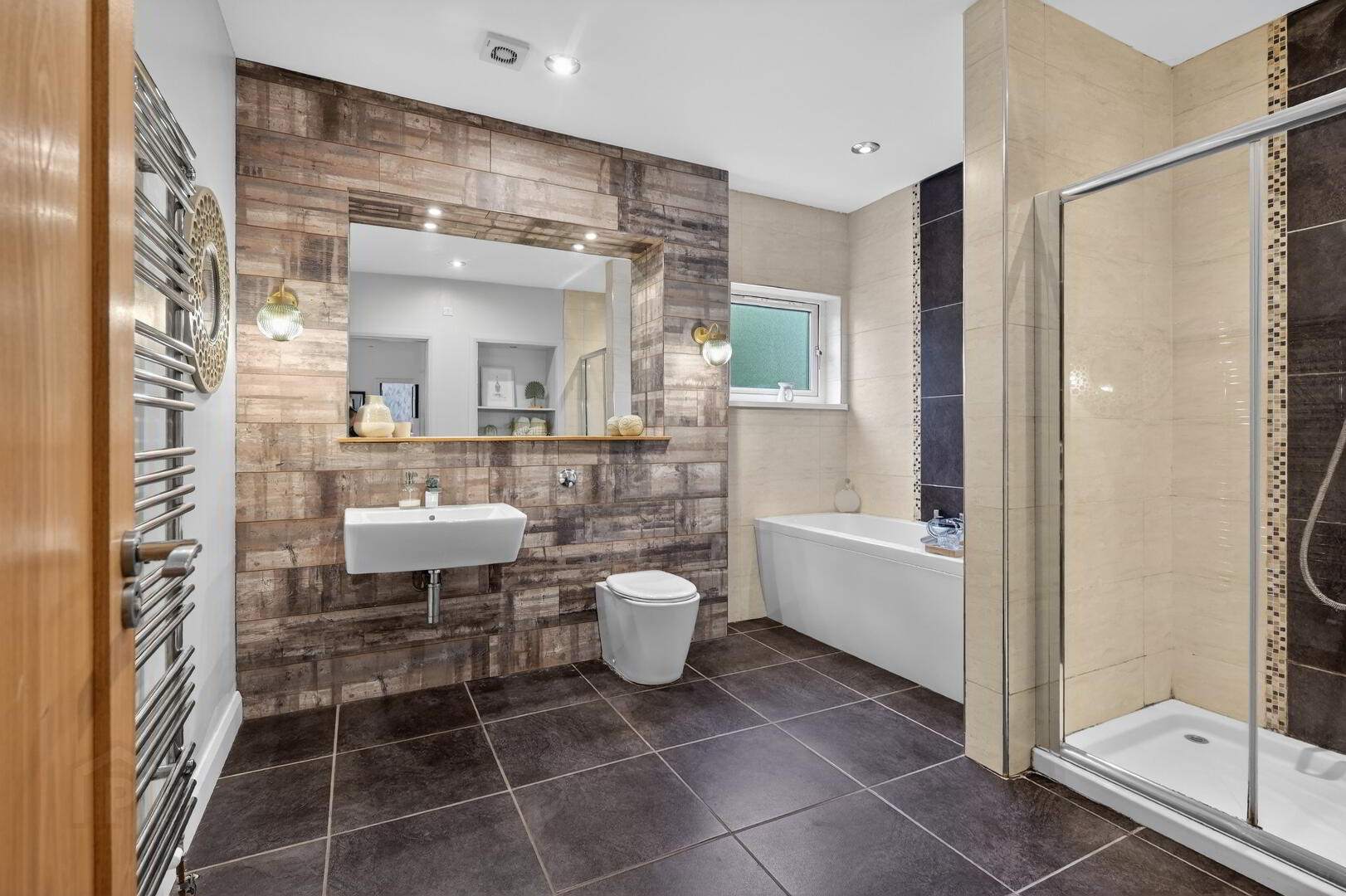 Modern 4 piece fully tiled bathroom with white suite bath and separate shower