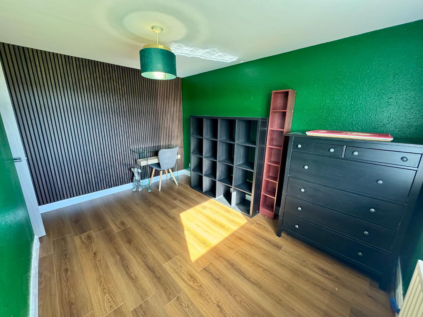 Built in storage, panelled wall, laminate wood flooring, window to front aspect with open outlook.