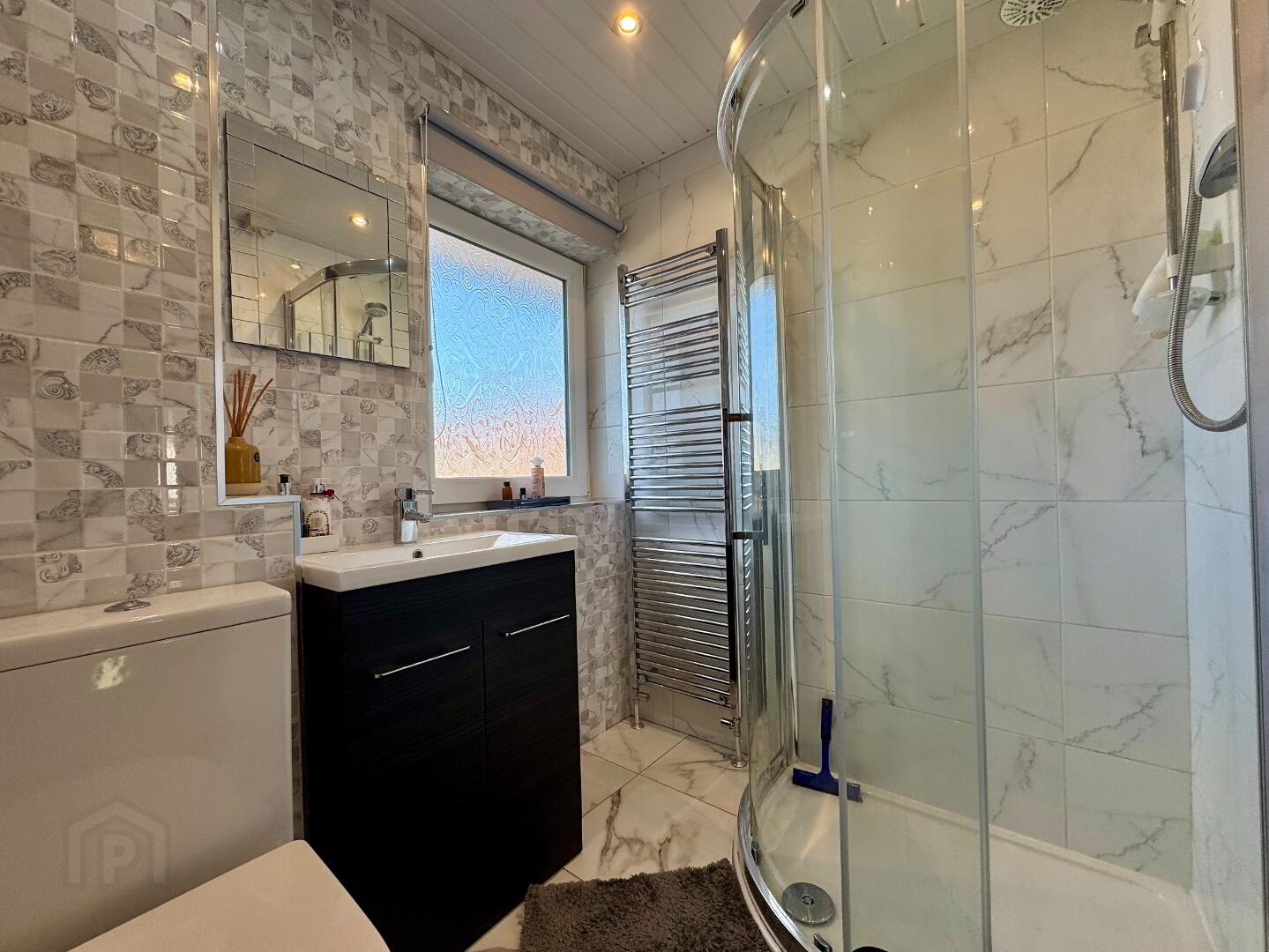 White suite comprising fully tiled shower cubicle, wash hand basin with mixer tap, low flush WC, towel rail, window to rear aspect, part tiled walls, ceramic tiled flooring.