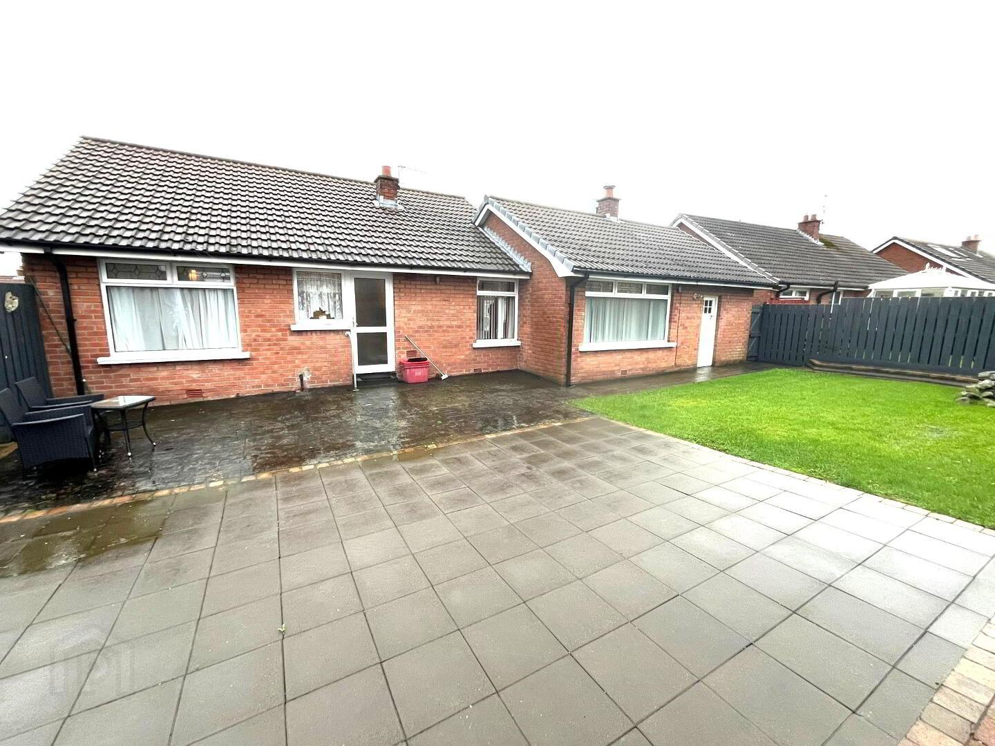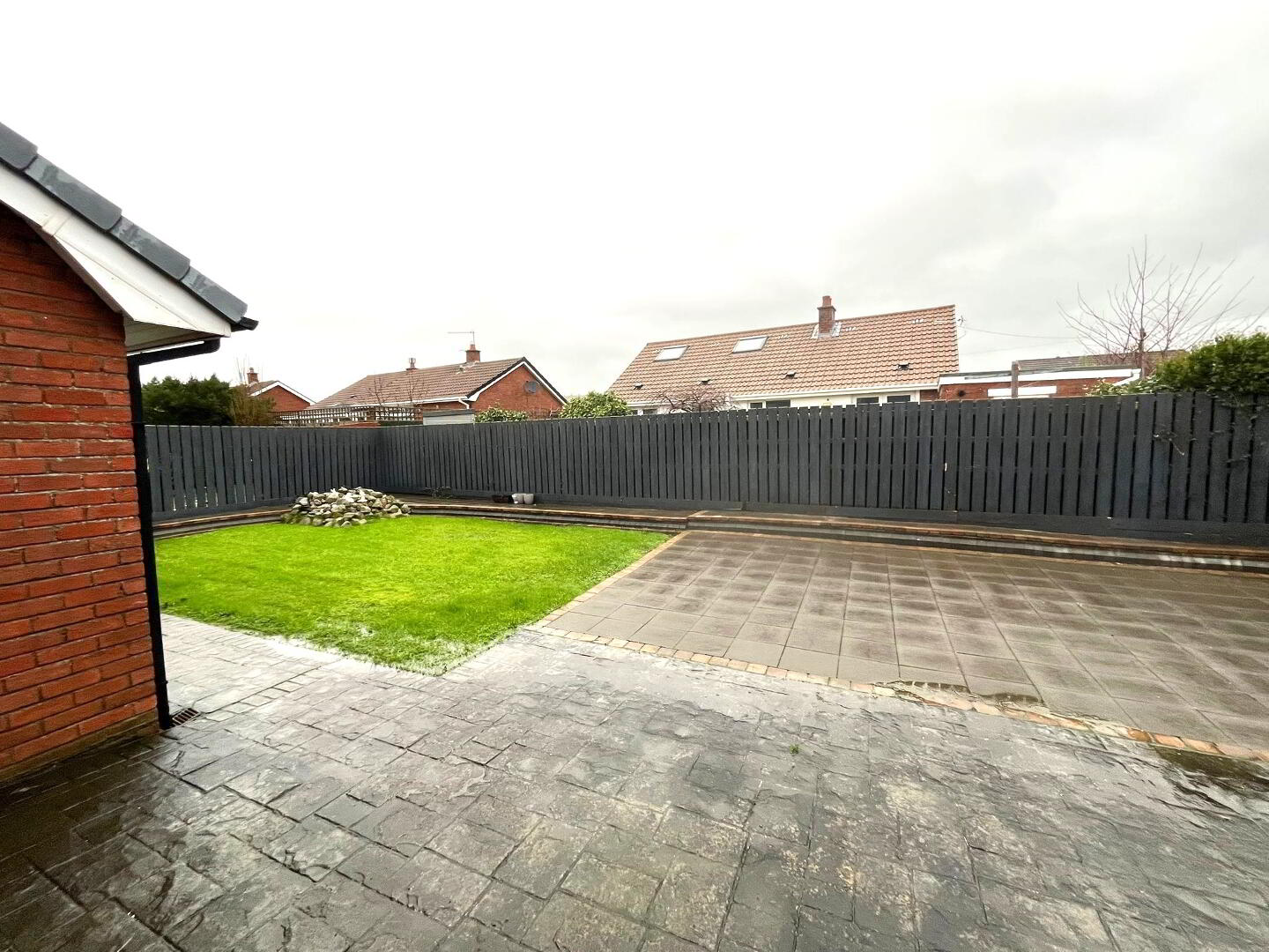 laid in lawn with patio area bounded by fencing.