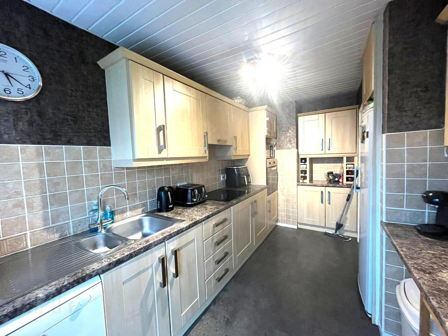 Fitted in a range of high and low level units with contrasting laminate work surfaces, inlaid 1 ½ bowl stainless steel sink unit with mixer tap, integrated hob, integrated oven,