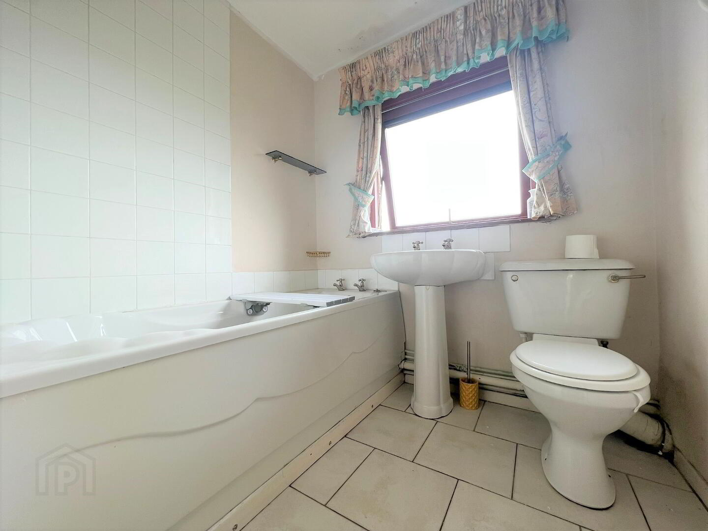 White suite comprising of panelled bath, low flush WC, pedestal wash hand basin, part tiled walls, ceramic tiled flooring, window to rear aspect.