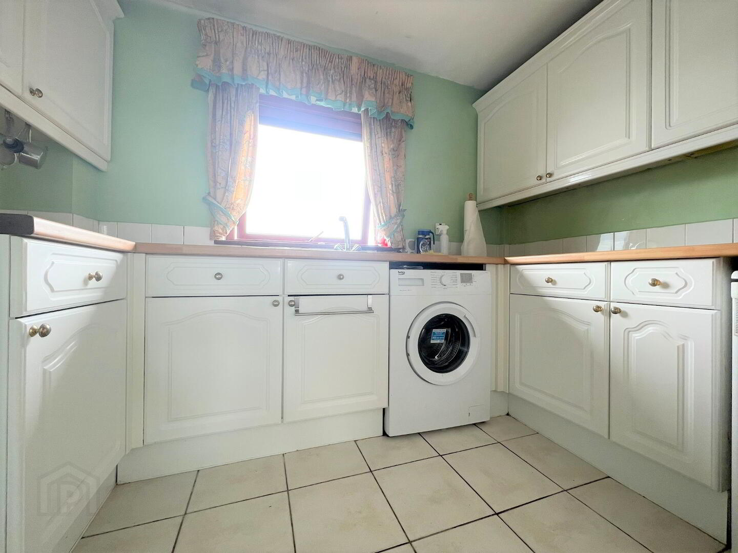 Fitted in a range of high and low level white fronted units with contrasting laminate work surfaces, inlaid single drainer stainless steel sink unit, part tiled walls, extractor fan, plumbed for washing machine, ceramic tiled flooring, window to rear aspect.