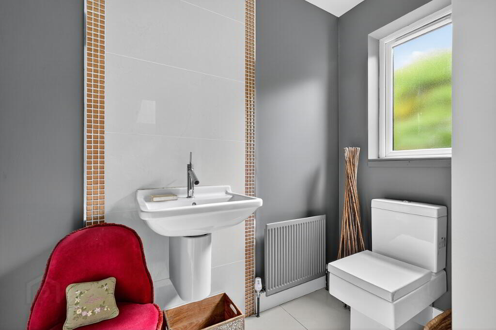 DOWNSTAIRS WC:White suite comprising of low flush WC, wall hanging wash hand basin, porcelain floor tiling, window to side aspect.FIRST FLOOR