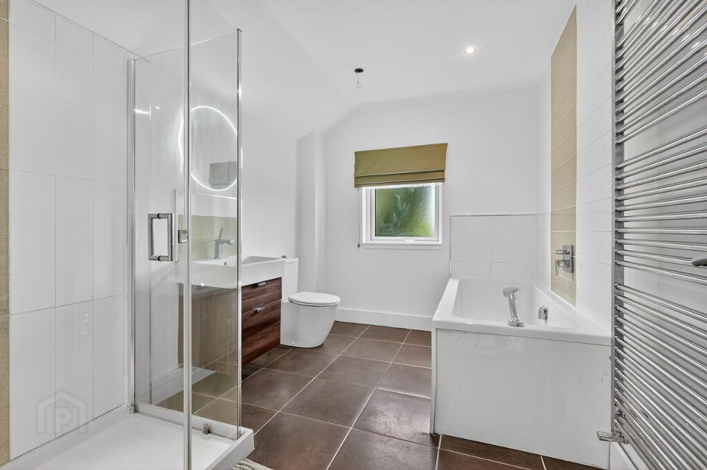en suite shower room plus 4 piece white family bathroom suite with both bath and separate shower cubicle.