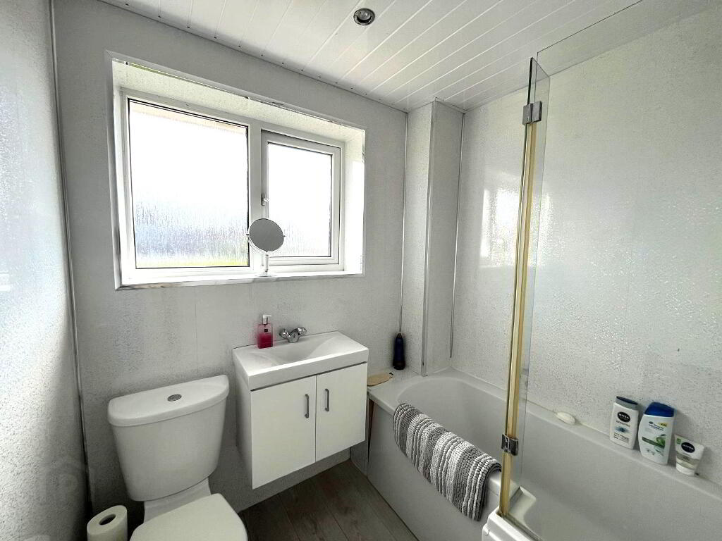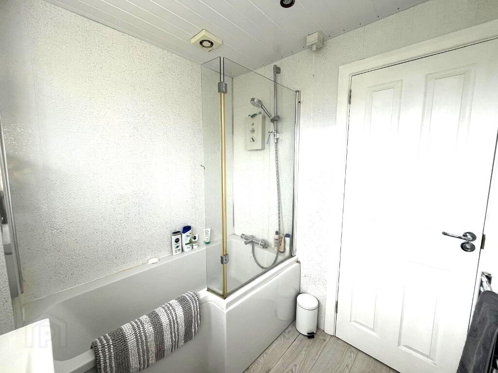 are 3 bedrooms accompanied by a 3 piece white bathroom suite with panelled bath and shower over.
