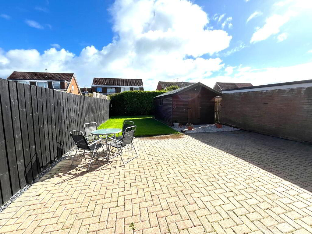 Front laid in lawn and shrubs. Fully enclosed rear laid in patio and lawn with large shed.