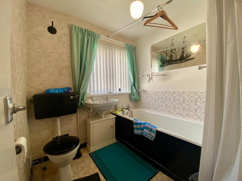 Suite comprising panelled bath, pedestal wash hand basin with mixer tap, low flush WC, part tiled walls, towel rail, window to rear aspect.