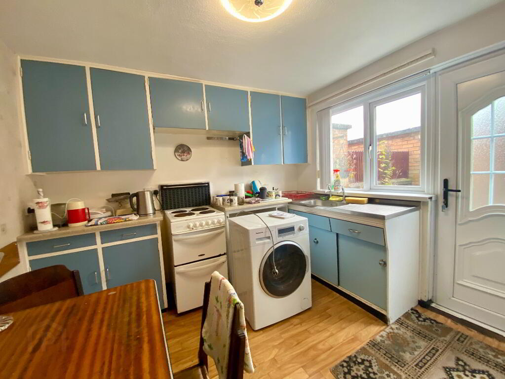 Fitted in a range of high and low level units with contrasting laminate work surfaces, recess for oven, inlaid single drainer stainless steel sink unit with mixer tap, window and PVC door to rear garden, laminate wood flooring, built in storage.