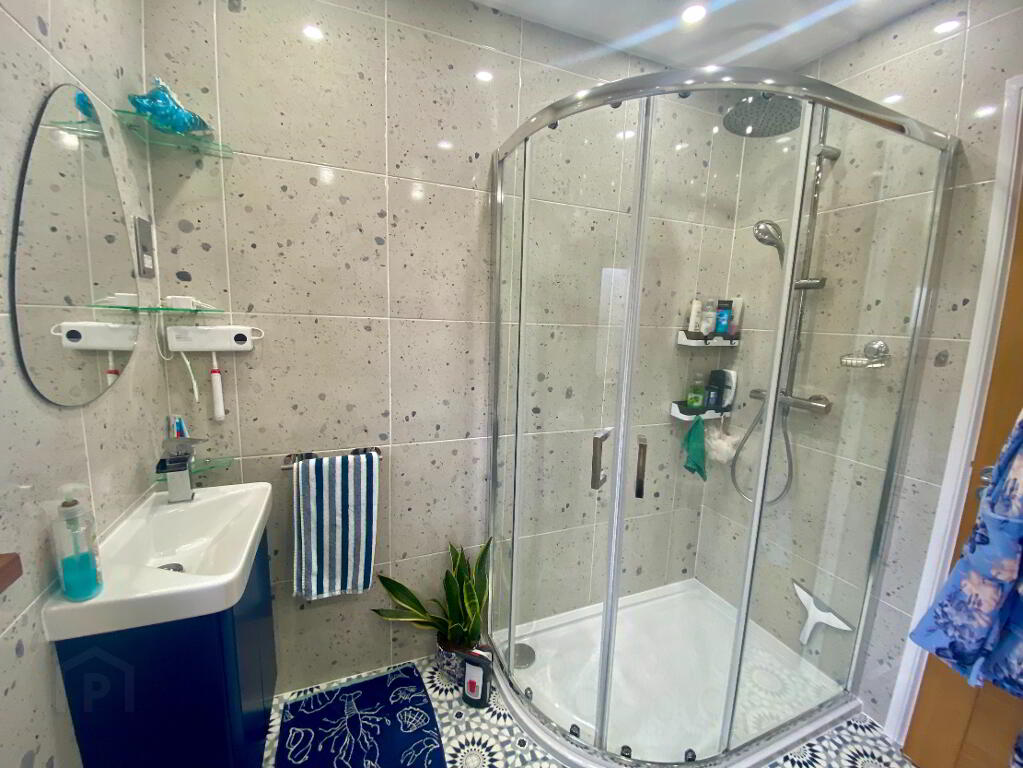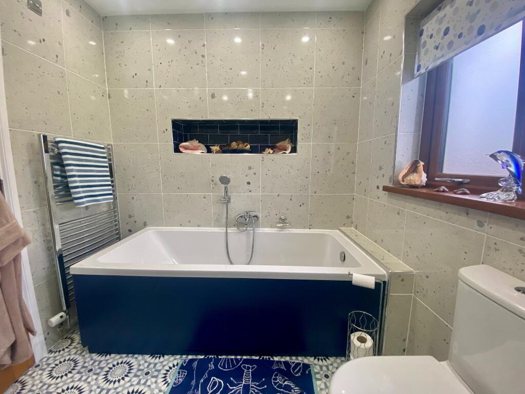 White suite comprising panelled bath with centralised mixer tap and shower attachment, separate shower cubicle with rainfall attachment, wash hand basin set in vanity unit with mixer tap, low flush WC, chrome towel rail, ceramic tiled flooring, fully tiled walls, window to rear aspect.