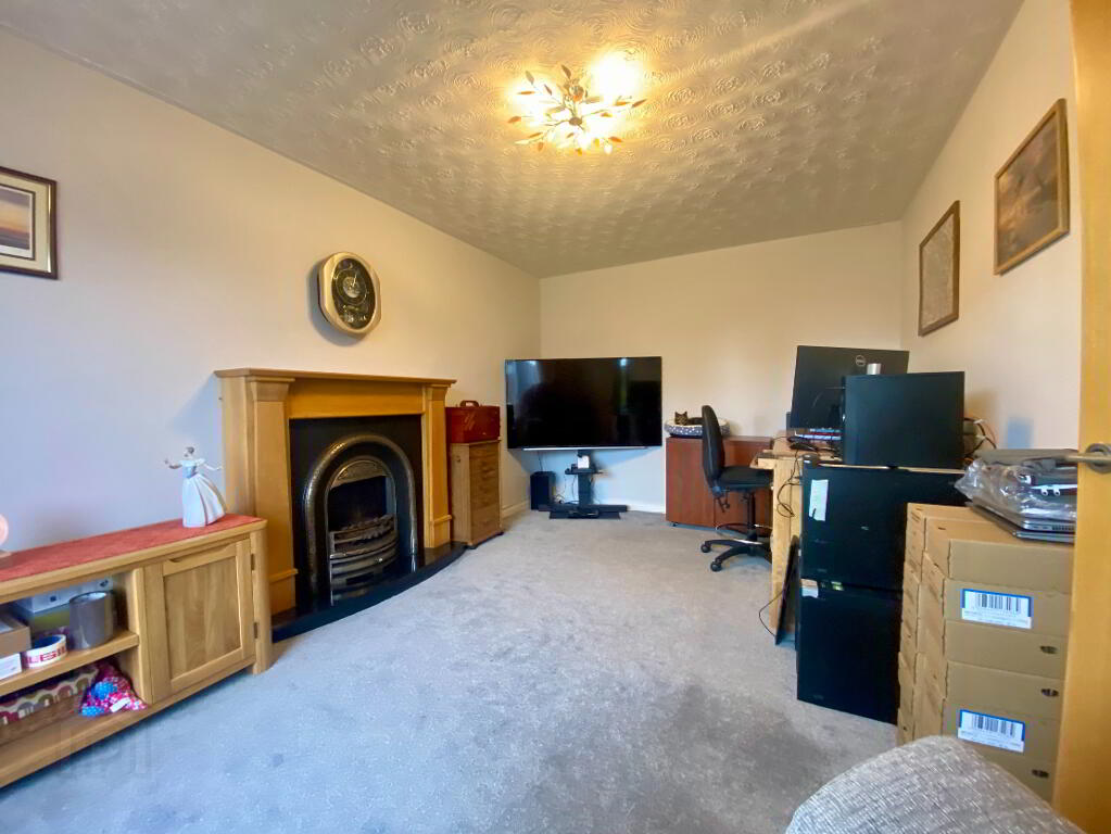 Feature electric fireplace, window to front aspect, double doors to access dining room.