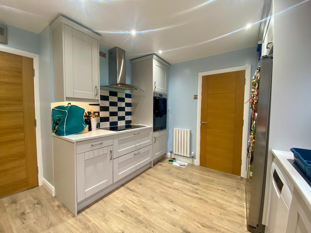 Fitted in a range of high & low grey fronted units with contrasting laminate work surfaces, inlaid single drainer stainless sink unit with mixer tap, plumbed for washing machine, window to side aspect, laminate wood flooring.