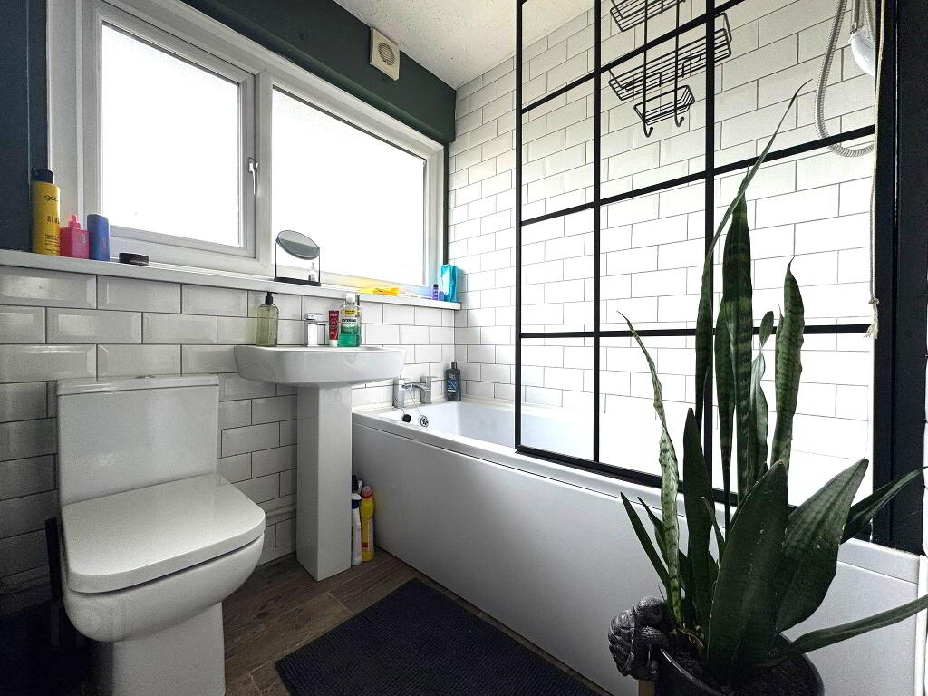 White suite comprising of panelled bath with mixer tap, electric shower and screen over, pedestal wash hand basin, low flush WC, window to rear aspect, part tiled walls, ceramic tiled flooring.