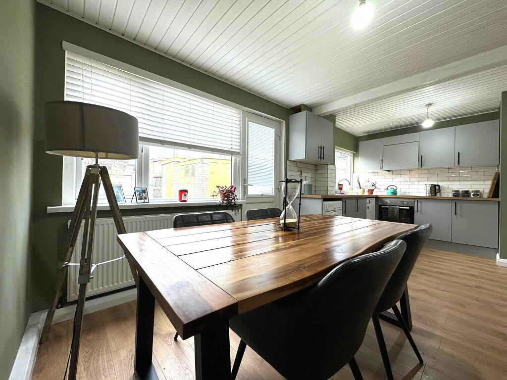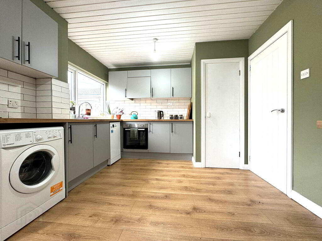 Fitted in a range of high and low level units with contrasting laminate work surfaces, inlaid single drainer stainless steel sink unit with mixer tap, integrated oven, hob and extractor fan, plumbed for washing machine, plumbed for dishwasher,part tiled walls, laminate wood flooring, windows to rear aspects.