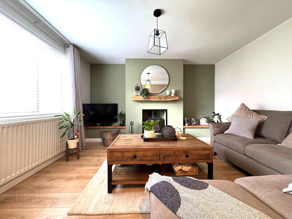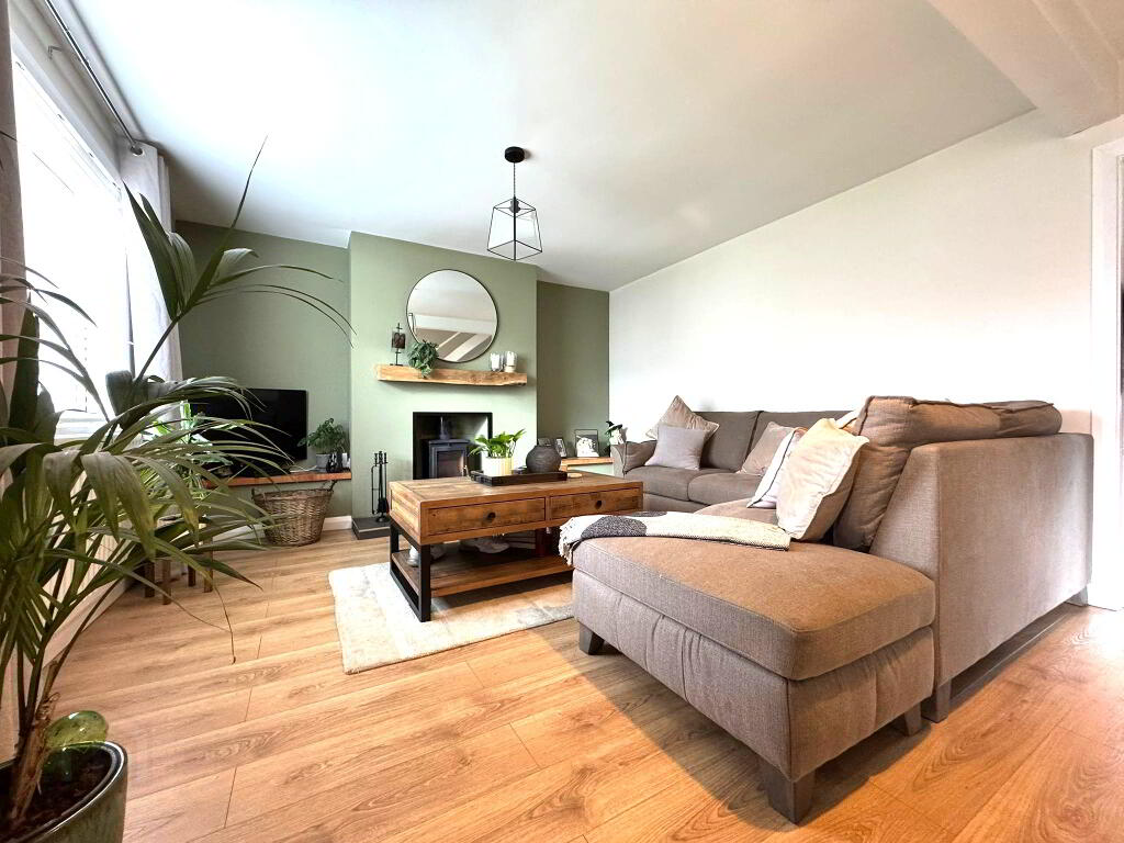 Feature wood burning stove, window to front aspect, laminate wood flooring, stairs to first floor.